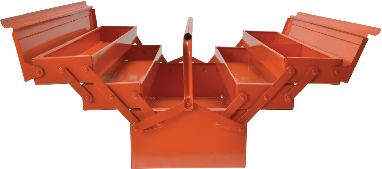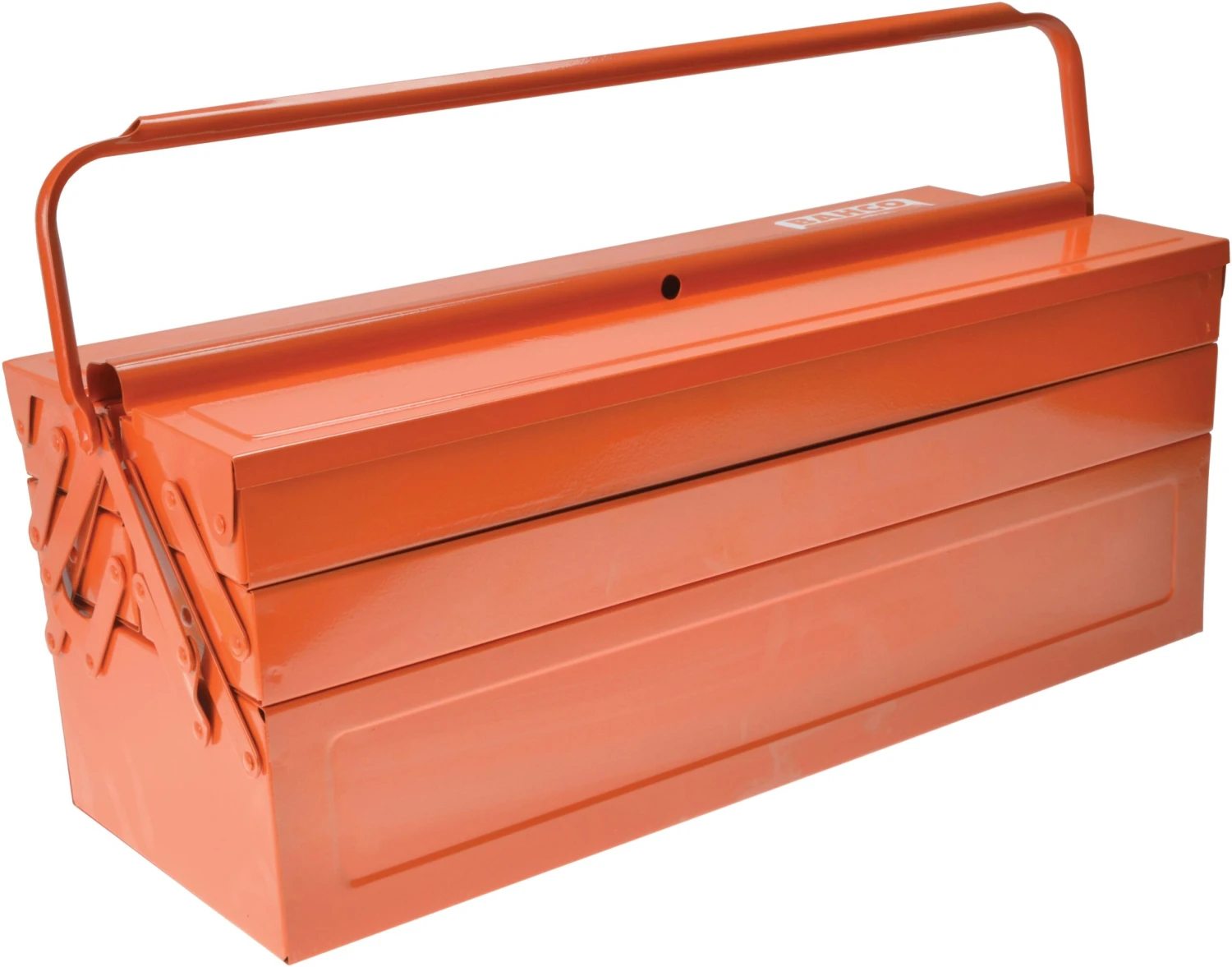 This Bahco Cantilever Tool Box is made of steel with a orange, hammer tone baked enamel finish. By pulling the handle the box opens up easily and gives immediate access to all five tool compartments. With an excellent storage capacity for a range of hand tools and fixings. The handle can be folded for compact storage. Lockable, the lid incorporates provision for a padlock (not included).