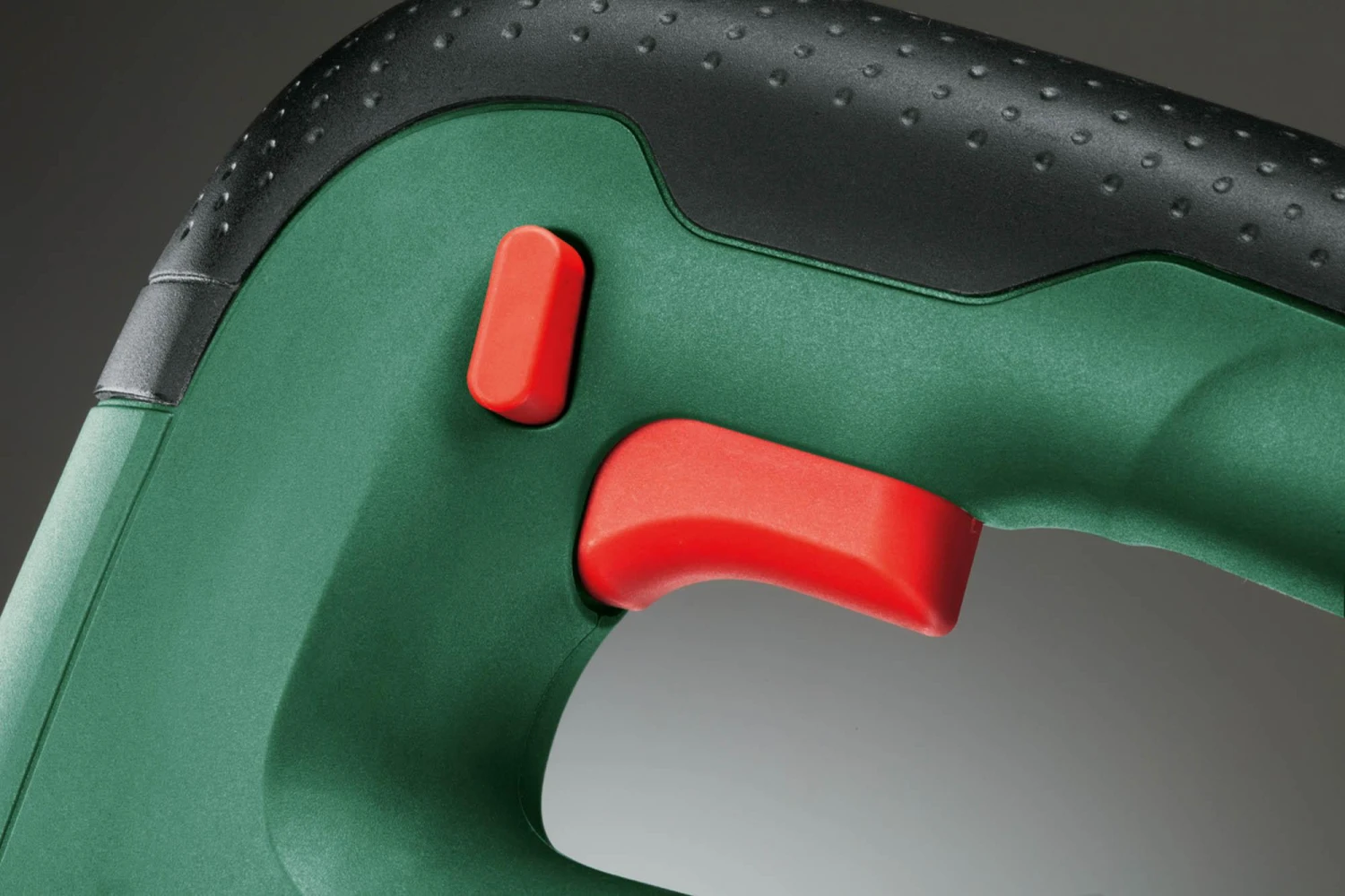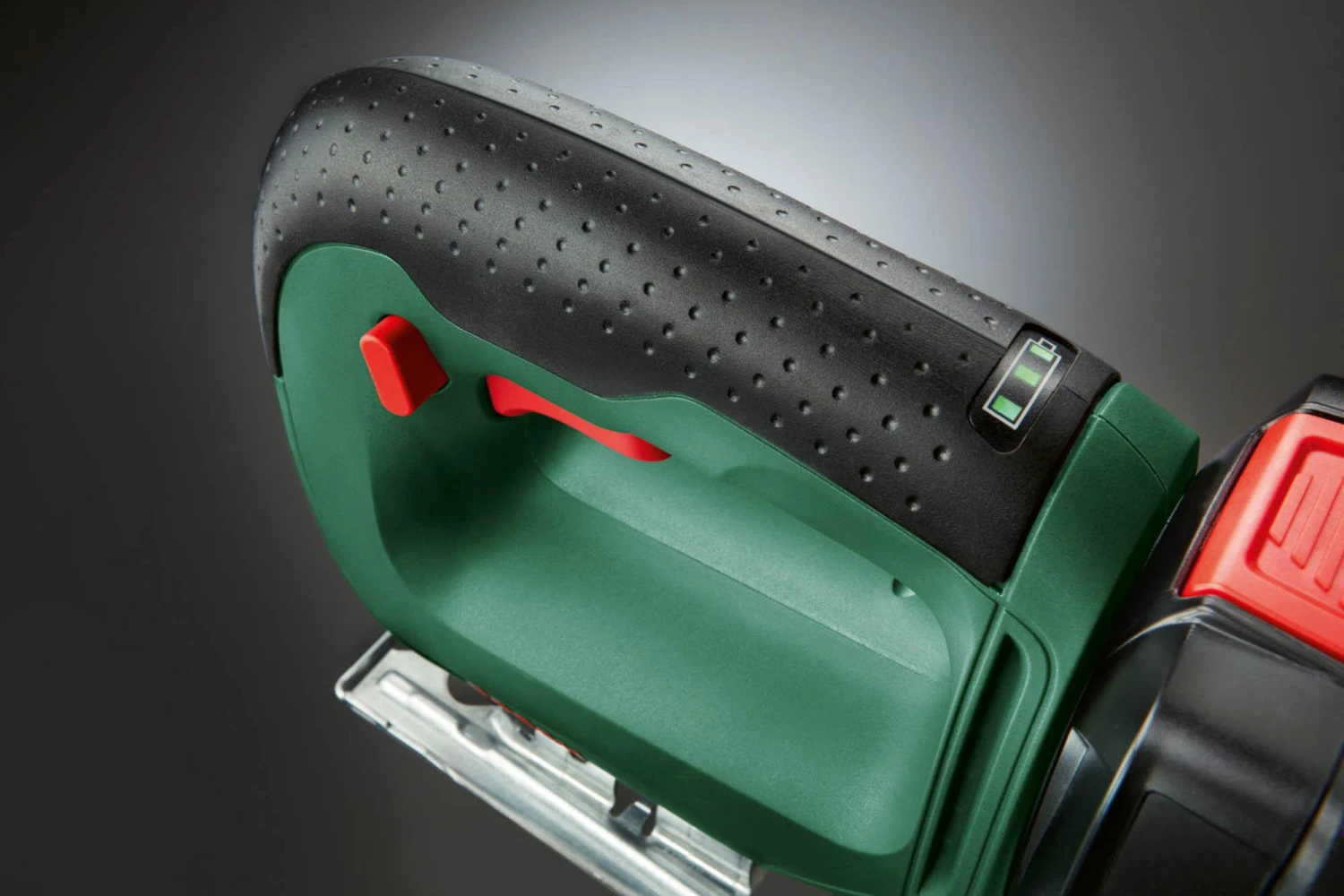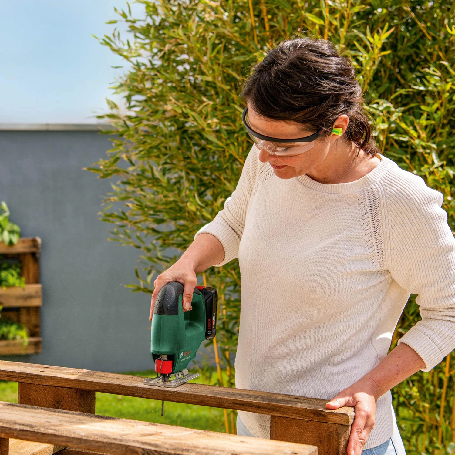 Simple and reliable, the compact Bosch EasySaw 18V-70 is the trusty choice for interior DIY and creative projects. Effortlessly operated with just one button, this lightweight jigsaw handles straight and curved cuts up to 70-mm depth in wood, such as wooden shelving or laminate flooring, and up to 6-mm depth in metal. Additional convenience is provided by a speed trigger for soft tool start-up and speed adjustment. To ensure accurate cuts, sawing lines stay visible with a special blowing function that clears sawdust aside. The saw blade is switched out easily thanks to a built-in SDS system. The tool belongs to the POWER FOR ALL ALLIANCE. One battery can operate a large variety of tools from different brands.