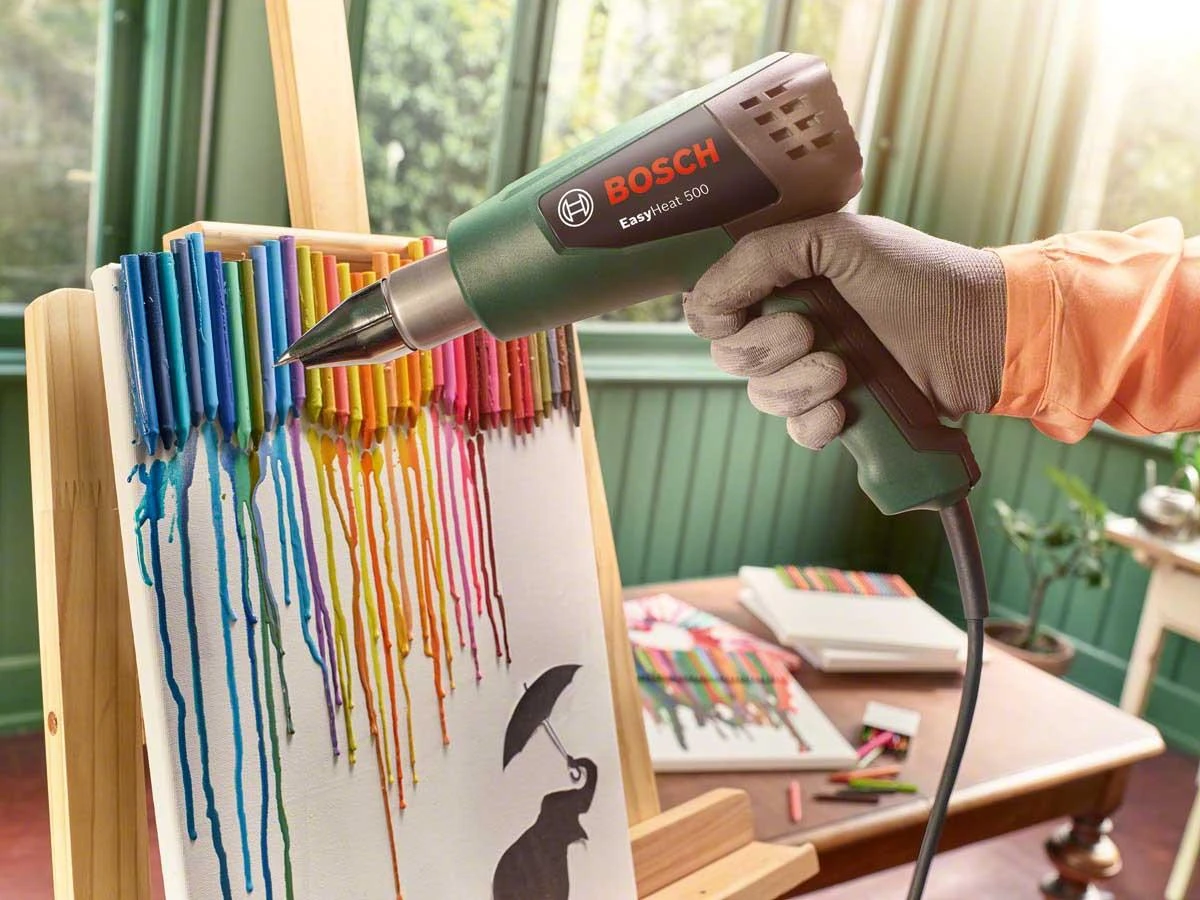 The EasyHeat 500 has a lightweight, compact design and a comfortable grip zone for easy and ergonomic work. The simple user interface has two temperature-setting icons to easily choose the correct mode depending on the application. Additionally, it also offers a rubberised, slip-resistant back for standing the tool to provide added stability. The heat gun can tackle many tasks with a variety of nozzles, such as removing paint, thawing water pipes, killing weeds, shrinking cables, and for creative projects.