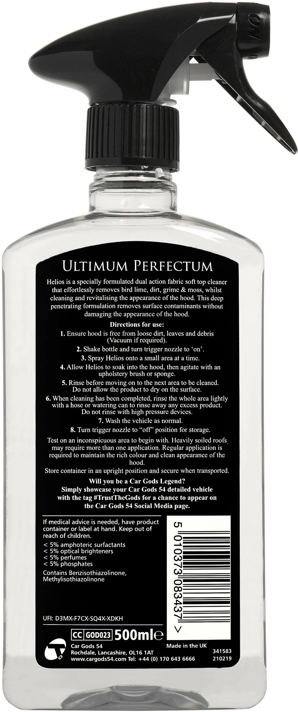Car Gods 54 Helios Soft Top Cleaner is a specially formulated dual action fabric soft top cleaner that effortlessly removes bird lime, dirt, grime & moss, whilst cleaning and revitalising the hood. This deep penetrating formulation removes surface contaminants without damaging the appearance of the hood.