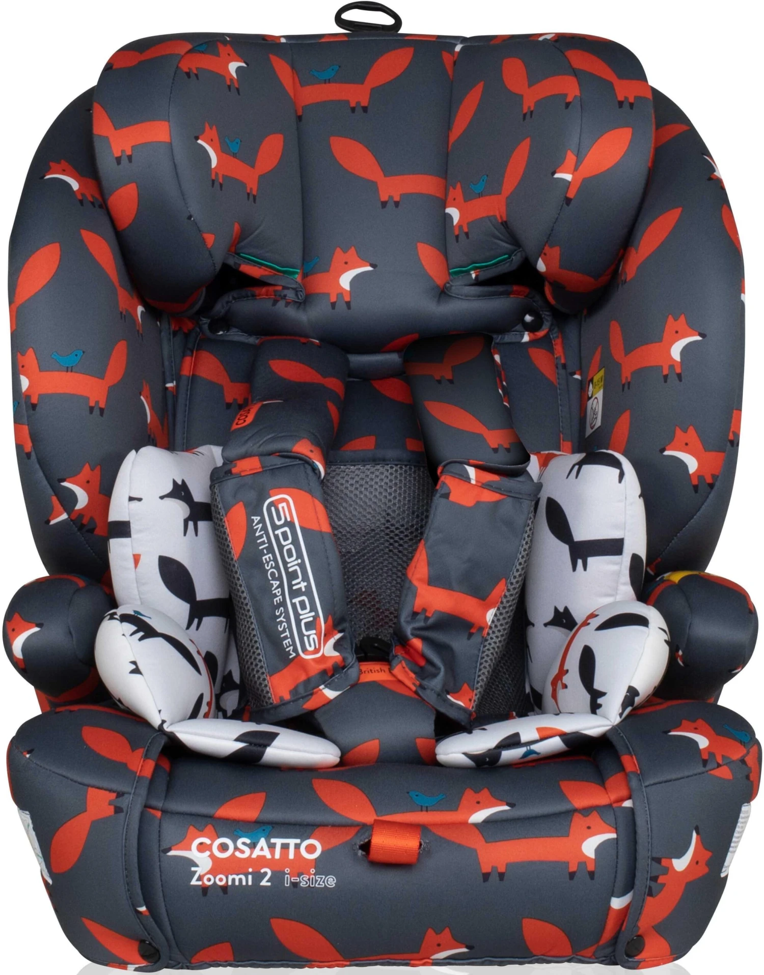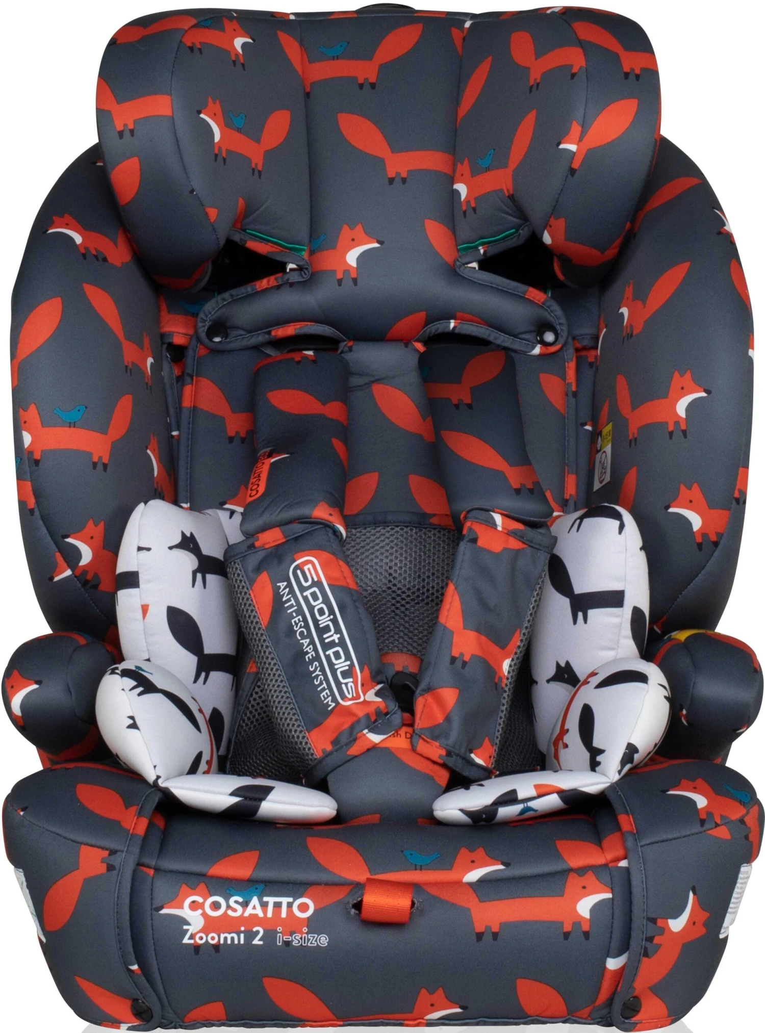 Zoomi 2 i-Size in Charcoal Mister Fox. ISOFIT car seat has had extensive crash and safety testing as part of the latest R129/i-Size standard, taking testing further with mandatory side impact testing – all using the latest crash test dummies – to help create safer car seats. Choose either belt-only fitting or belt with ISOFIX fittings for added security. Zoomi 2 i-Size also features the exclusive 5 Point Plus Anti-Escape System.