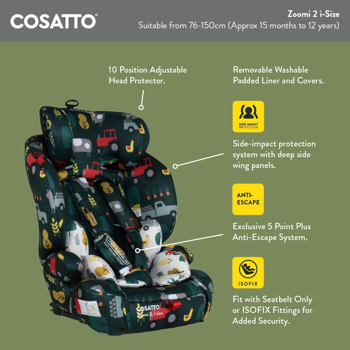 Cosatto Zoomi 2 i-Size car seat has a five-point safety harness, deep side wings and a thick padded head rest. The Zoomi 2 I-Size features side impact protection with shock absorbing memory foam – plus tummy pad, chest pads and comfy padded arm rests. Zoomi 2 i-Size keeps your precious passenger snug.