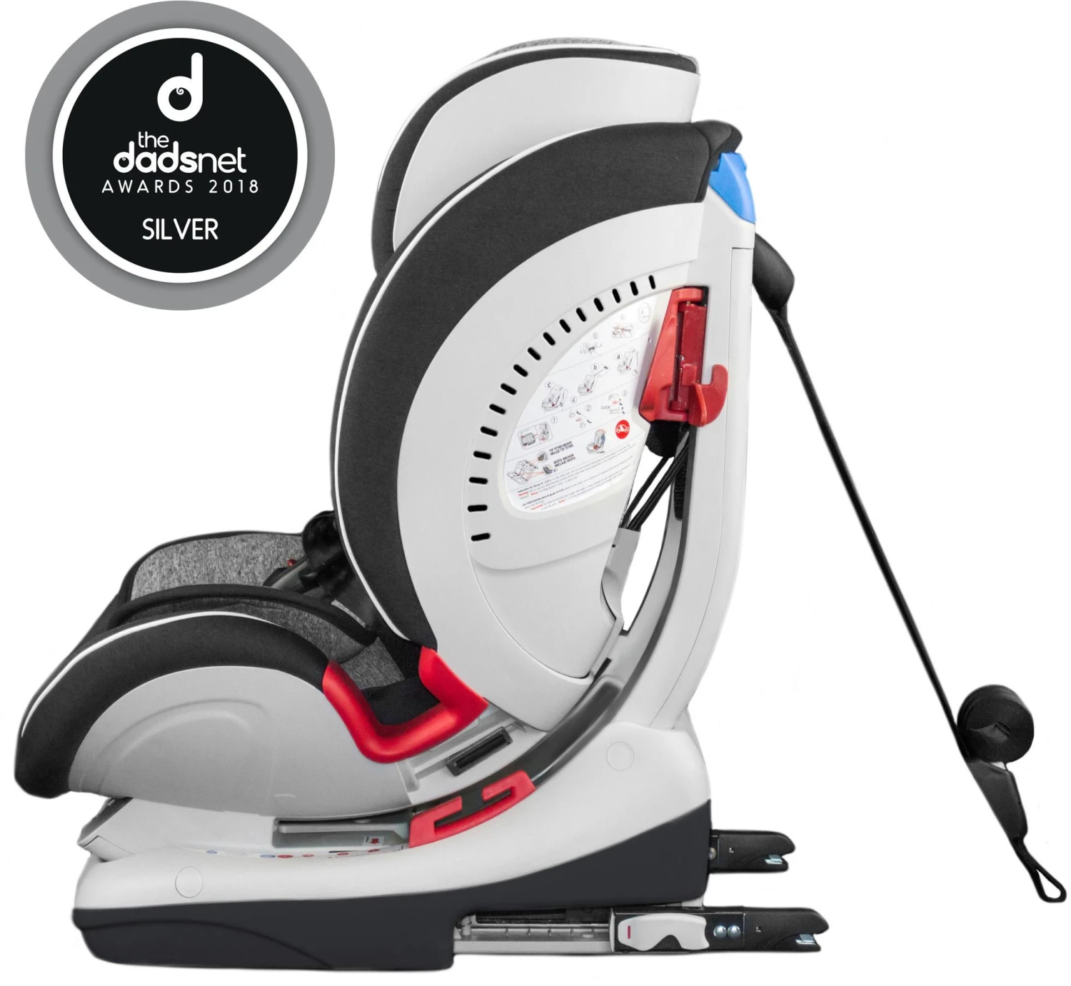 It can be fitted with the 3 point vehicle belt for rear facing and fitted using Isofix (with its unique front operational feature) and top tether or the adult 3 point seat belt for forward facing.