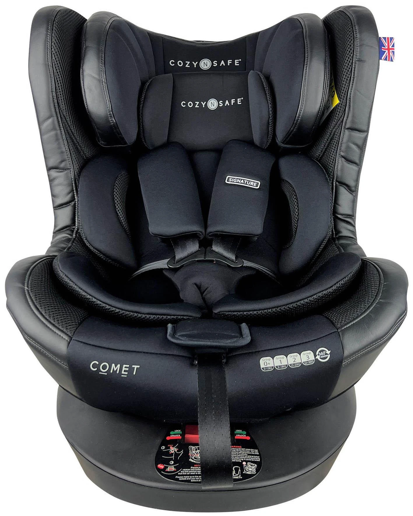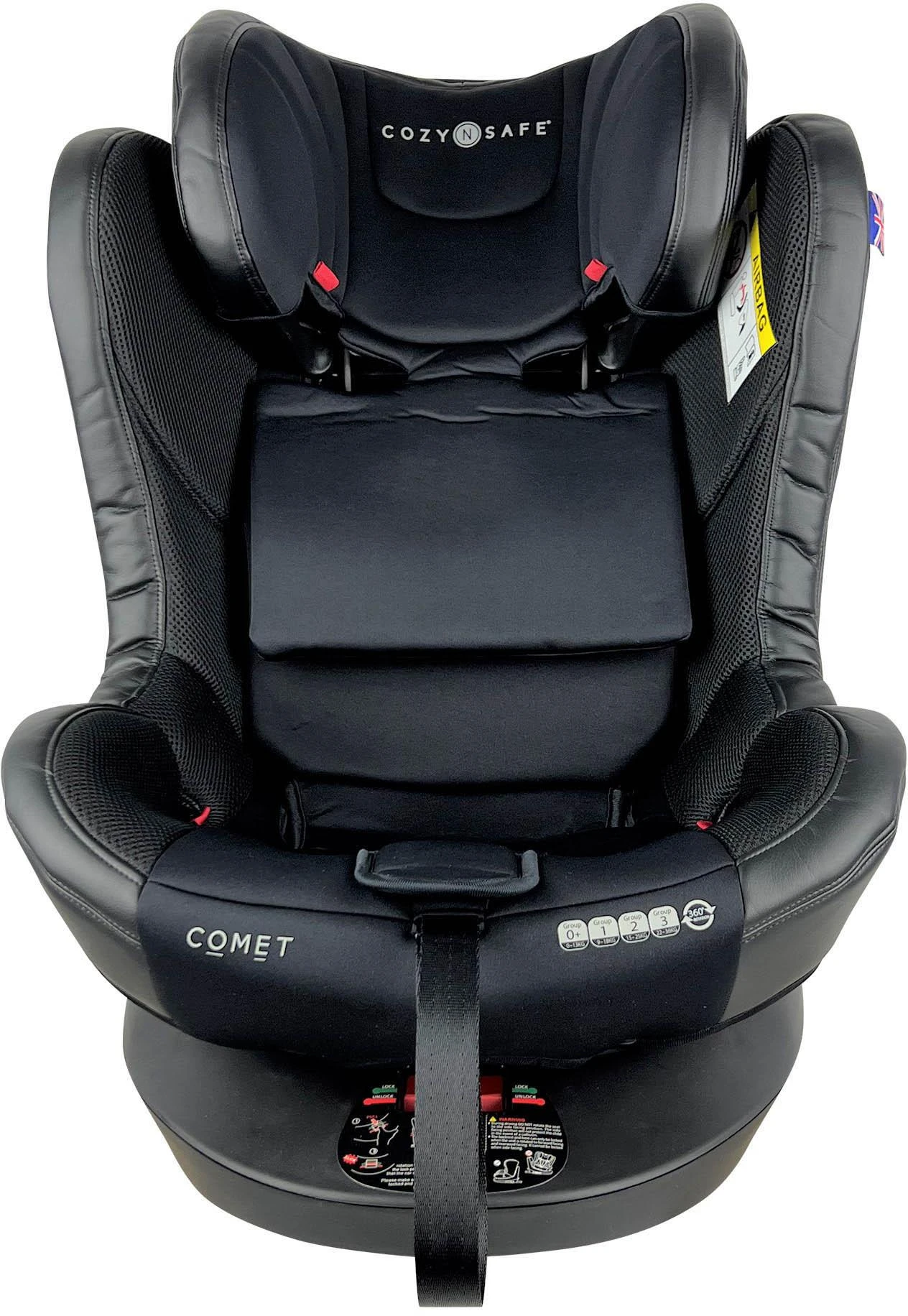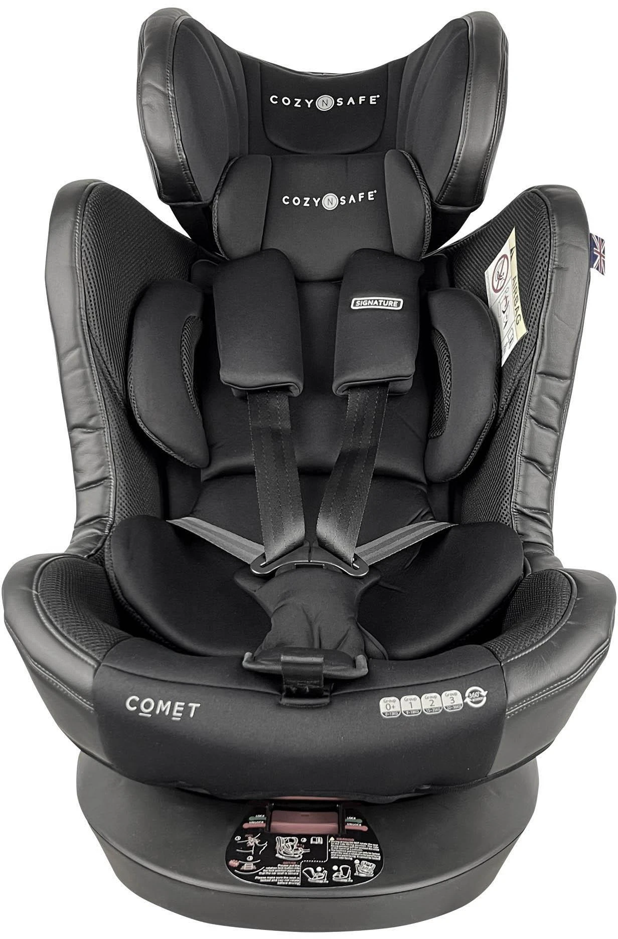 - The Cozy N Safe Comet Group 0+/1/2/3 360° Rotation Car Seat is the perfect blend of functionality and style. This one of a kind Infant seat offers uninterrupted access to your child without the hassle of unhooking the top tether. The top tether is attached to the base allowing you to spin the car seat a full 360° with the touch of a button unencumbered.