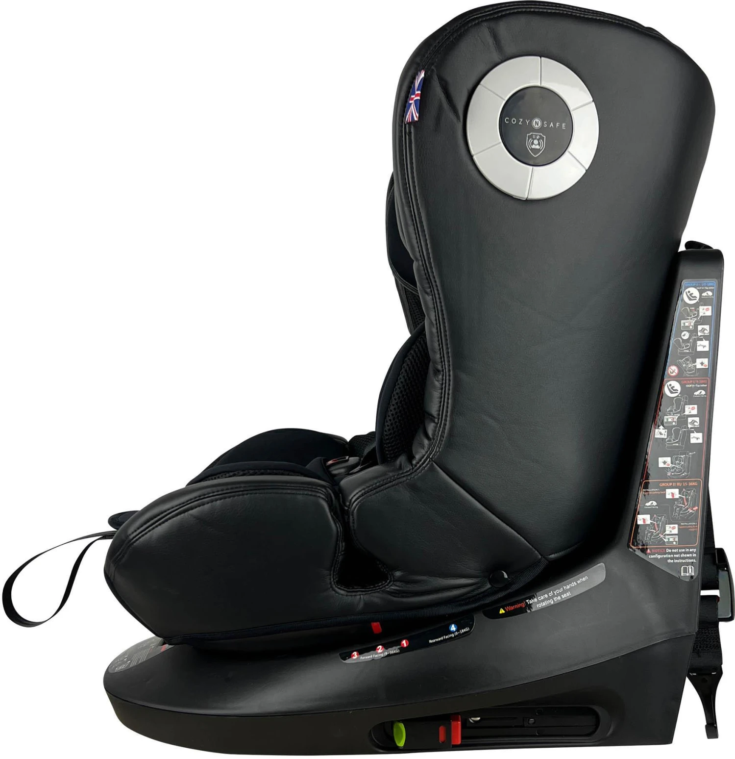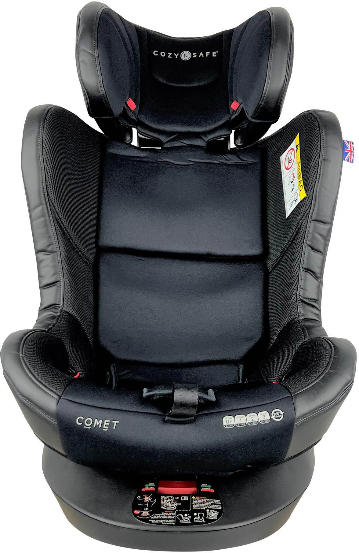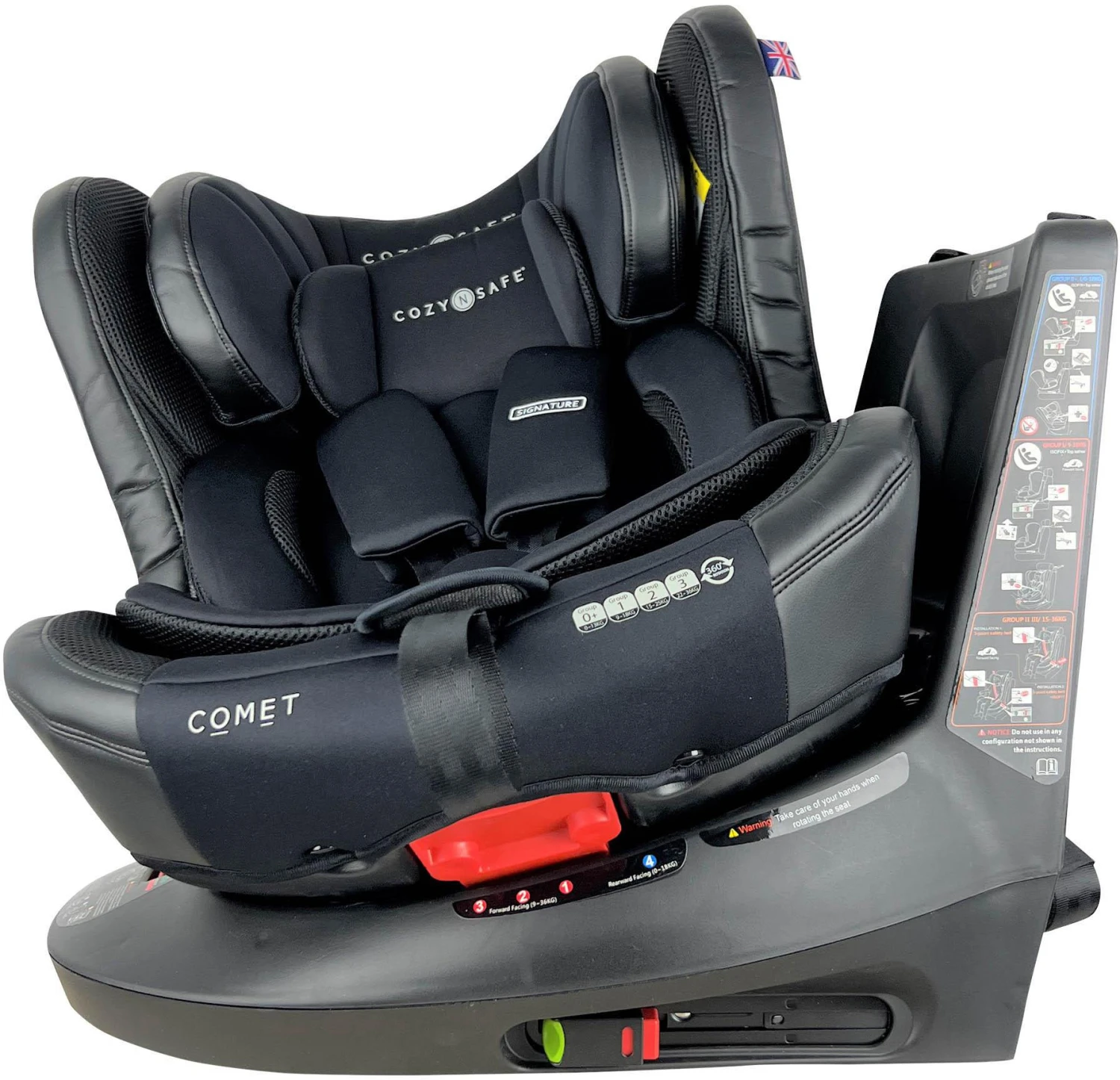 - The Cozy N Safe Comet Group 0+/1/2/3 360° Rotation Car Seat is the perfect blend of functionality and style. This one of a kind Infant seat offers uninterrupted access to your child without the hassle of unhooking the top tether. The top tether is attached to the base allowing you to spin the car seat a full 360° with the touch of a button unencumbered.