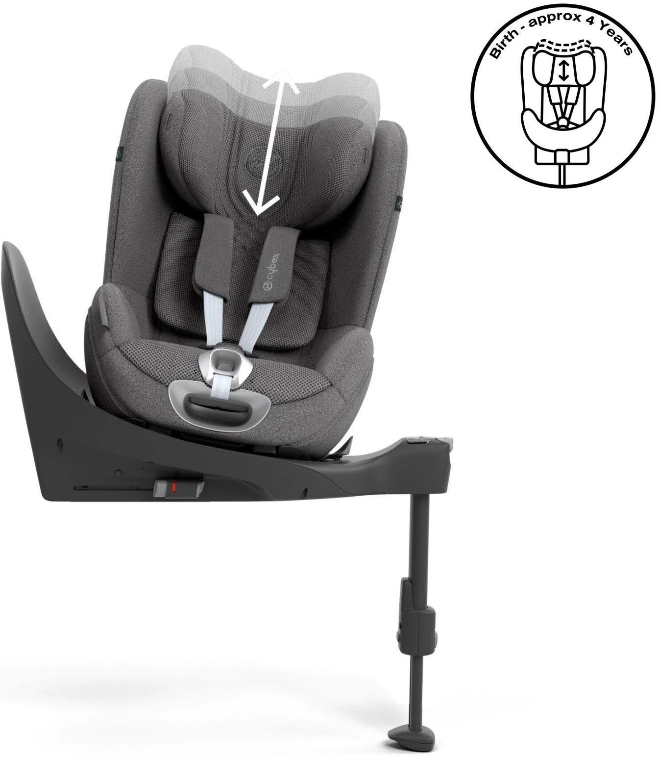 - Thanks to its height-adjustable headrest, the safety of the Sirona T i-Size evolves with your child, accommodating their rapid growth. With its 12 different positions, the car seat adapts to your child’s size during the first four years, providing steady protection throughout this time. When adjusting the headrest height the harness adjusts automatically to ensure a comfortable fit.