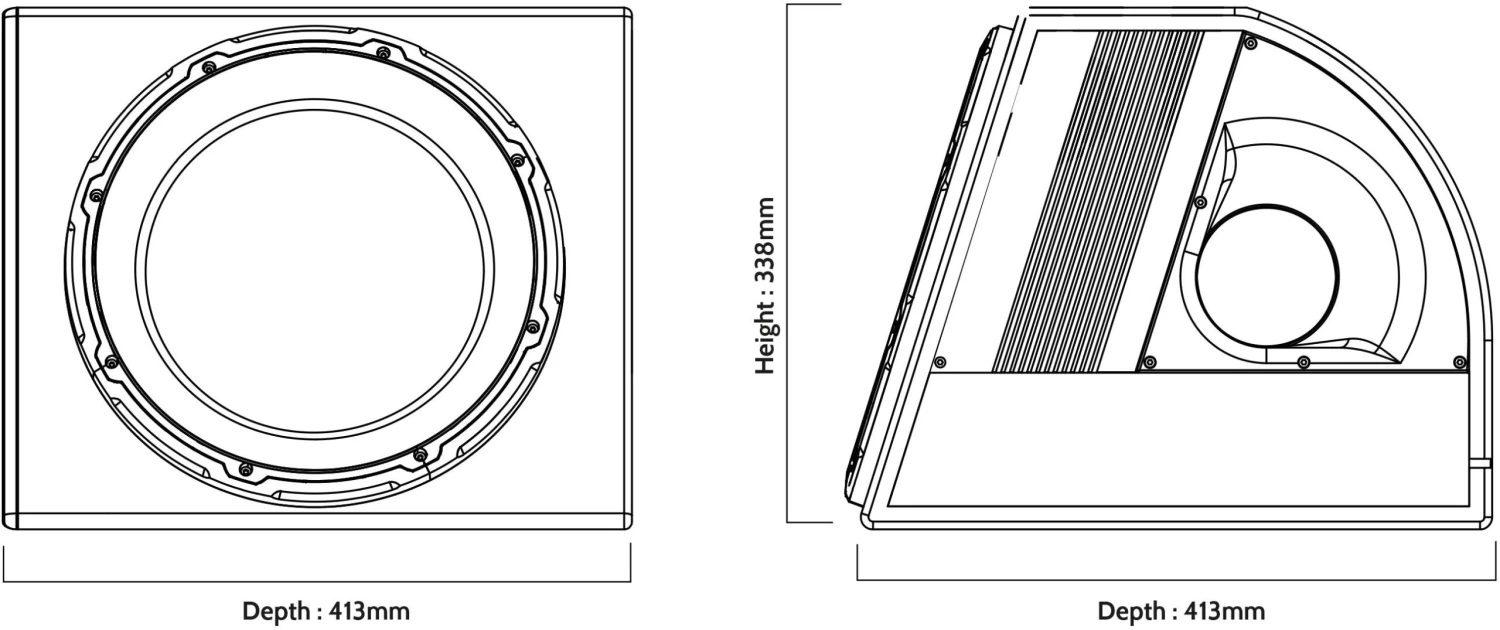 - Ported enclosure delivers powerful bass with side mounted port for compact design.