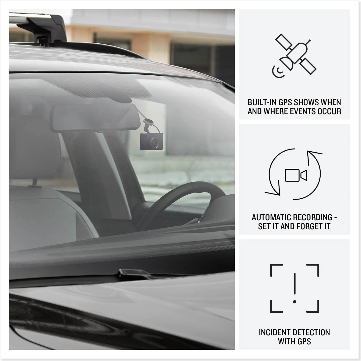 - Pocket-sized 56 x 41 x 22 mm camera goes virtually unnoticed on your windshield; automatically records and saves video of incidents with GPS location and time indications