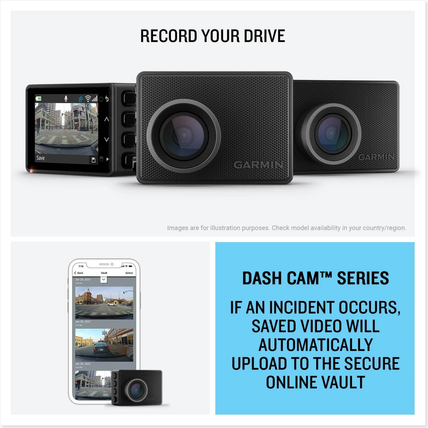 - Saved video clips automatically upload to the secure Garmin cloud Video Vault from which they can be viewed, downloaded, edited and shared from anywhere