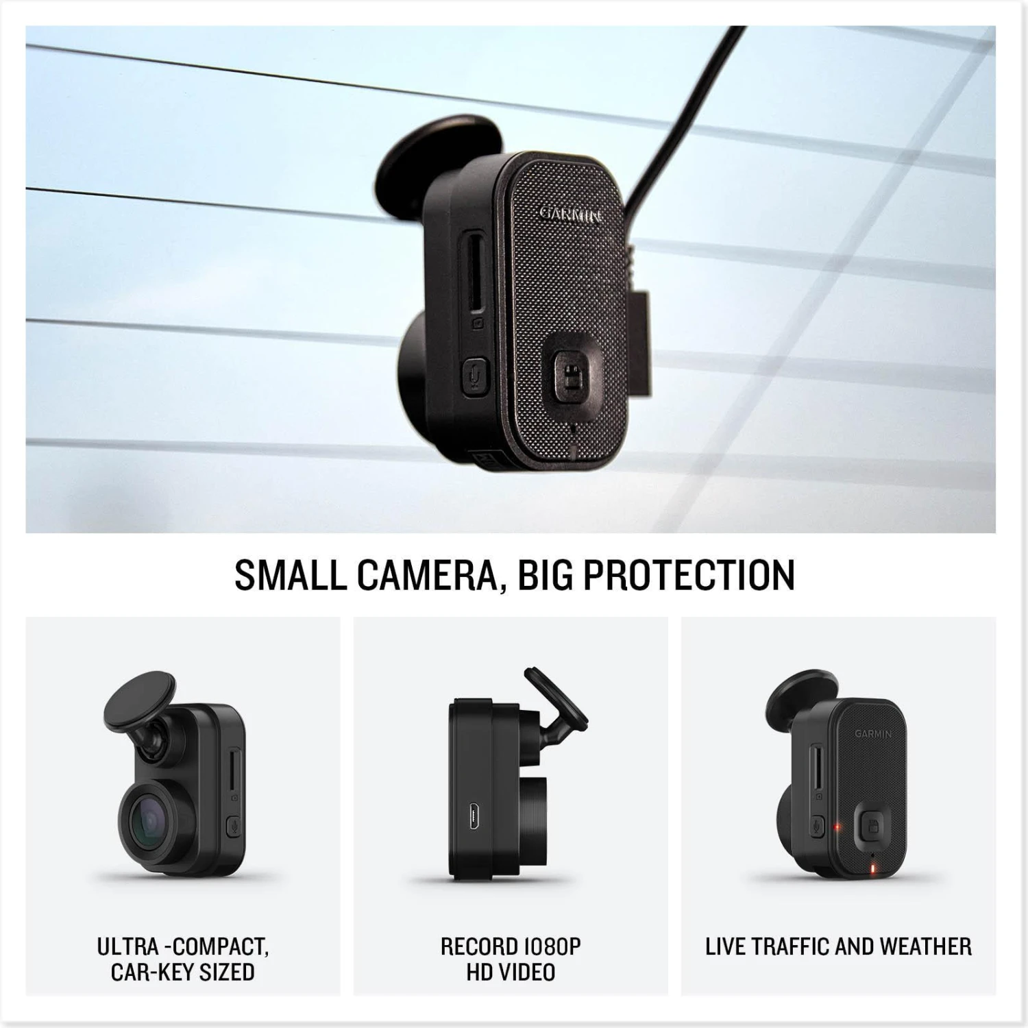 Tiny camera, huge protection. The car key-sized Garmin Dash Cam Mini 2 with voice control1 offers discreet eyewitness incident detection in 1080p HD video for vehicles on the road or parked. Once plugged into your vehicle’s power source, the camera continually records, capturing crisp details with its 140-degree wide angle lens. Saved incident footage is automatically uploaded to the secure Garmin cloud Video Vault2 for future use. Easily access the camera remotely for live-view3 monitoring on your phone. For added security, the Parking Guard function3 will record and send a video clip to your phone if your parked vehicle is hit or broken into. Sync up to 4 dash cams to show multiple points of view around your vehicle with the Garmin Drive™ app.