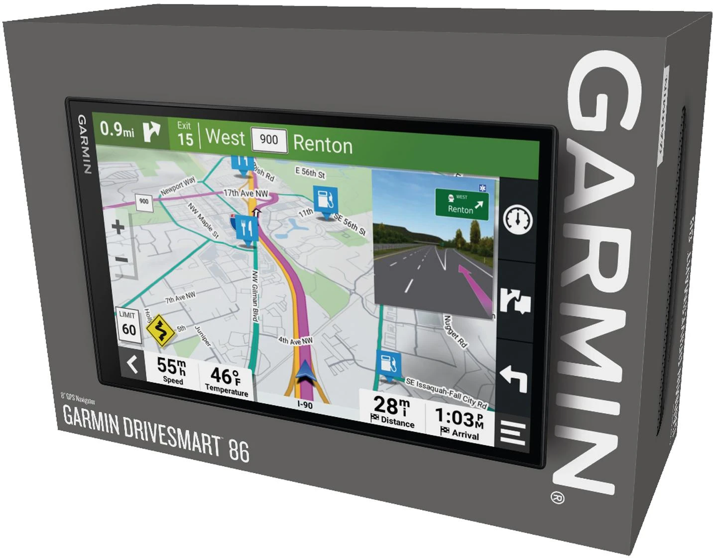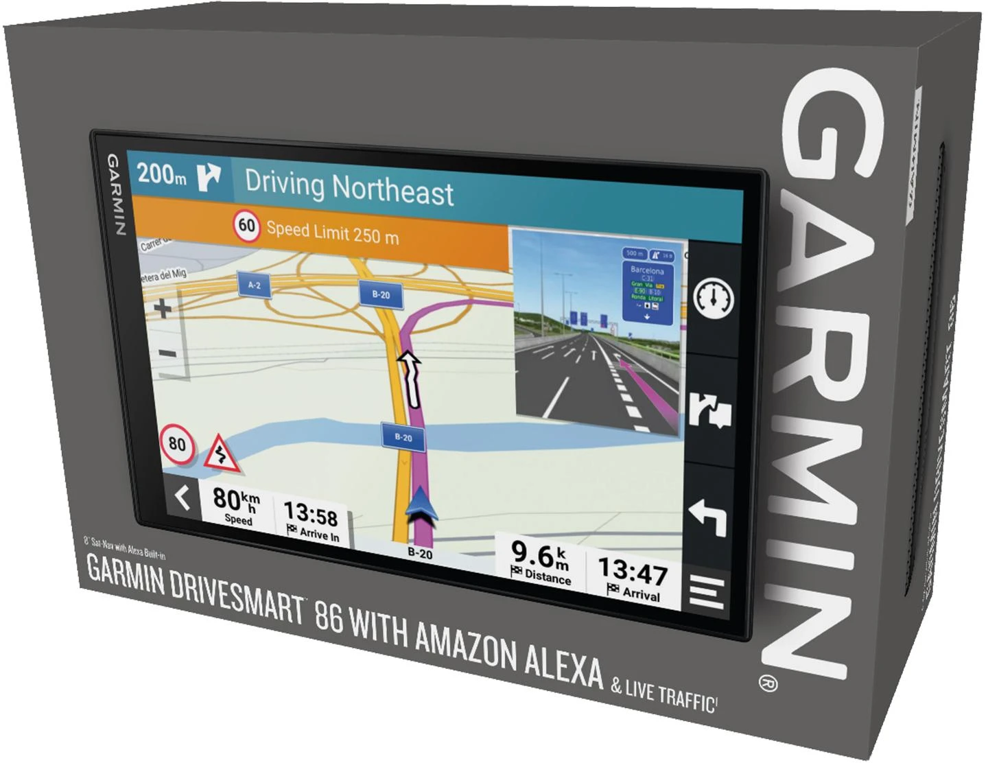 Simplify your drive with the Garmin DriveSmart™ 86 sat nav. Use Garmin voice assist to easily find and navigate where you want to go. The crisp 8” dual-orientation display and map updates of Europe show you the way, providing environmental zone routing and alerts for potential hazards ahead. Make the most of road trips with Tripadvisor® traveller ratings and millions of Foursquare® POIs. Pair with the Garmin Drive™ app on your compatible smartphone for on-screen access to live traffic, fuel prices, parking, weather and traffic cams to help avoid delays and keep you on your way. With Alexa Built-in1, you can ask to play music, listen to audiobooks, hear the news and more — all while you keep your hands on the wheel and eyes on the road.