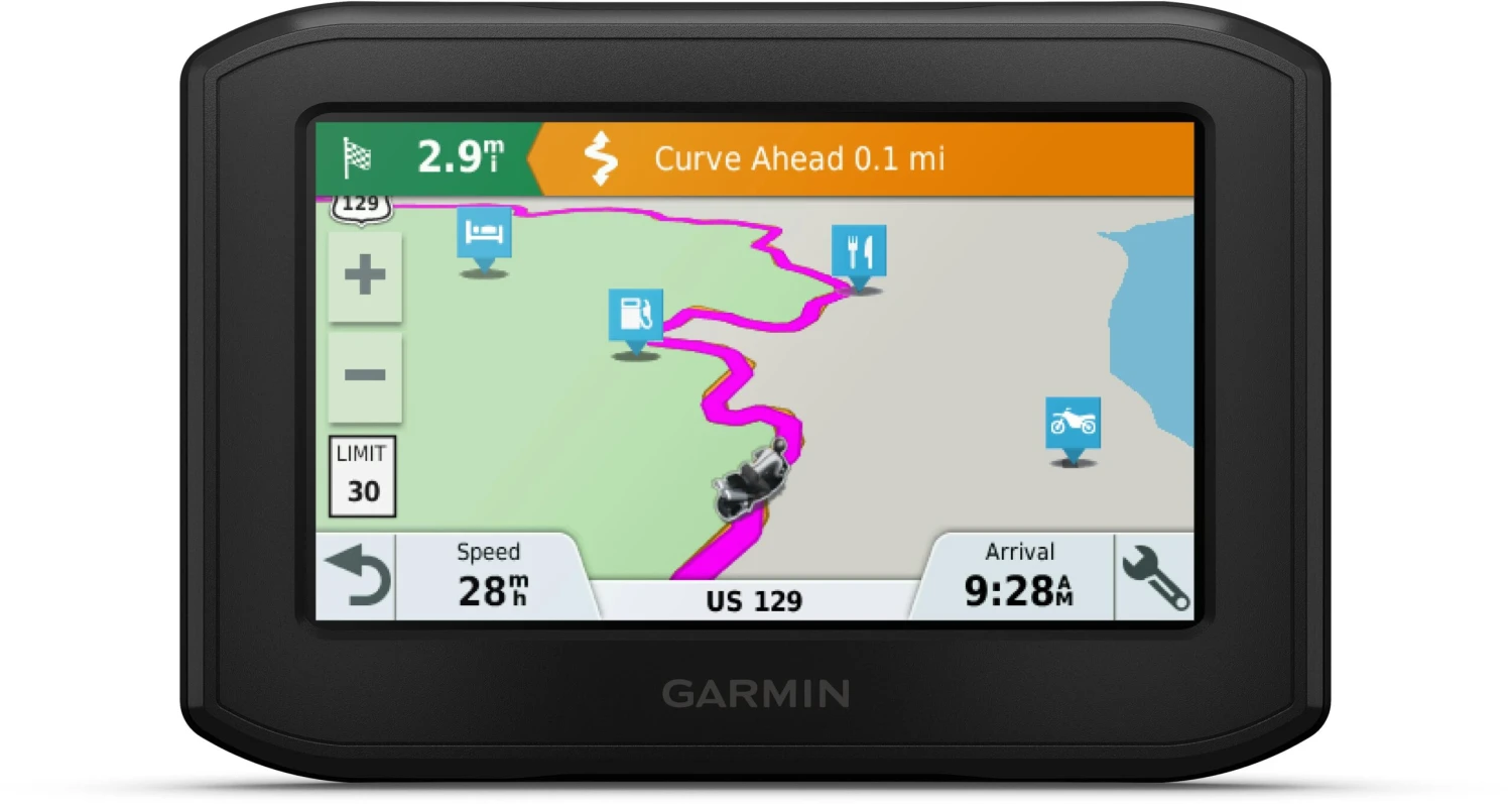 - Helpful rider alerts for upcoming sharp curves, railway crossings and more