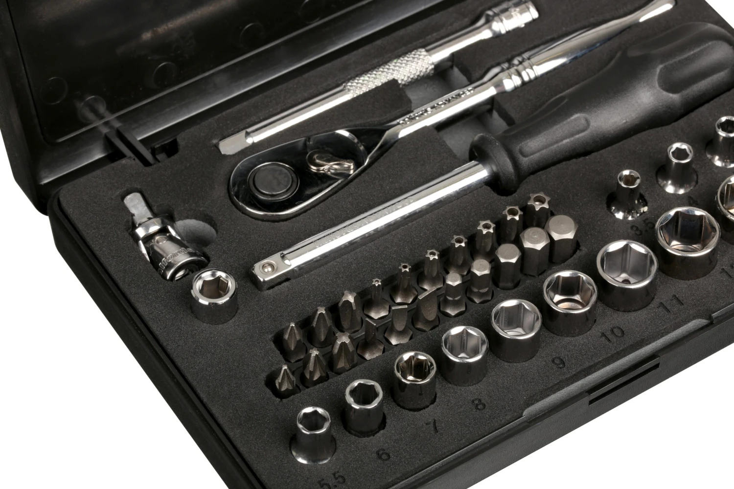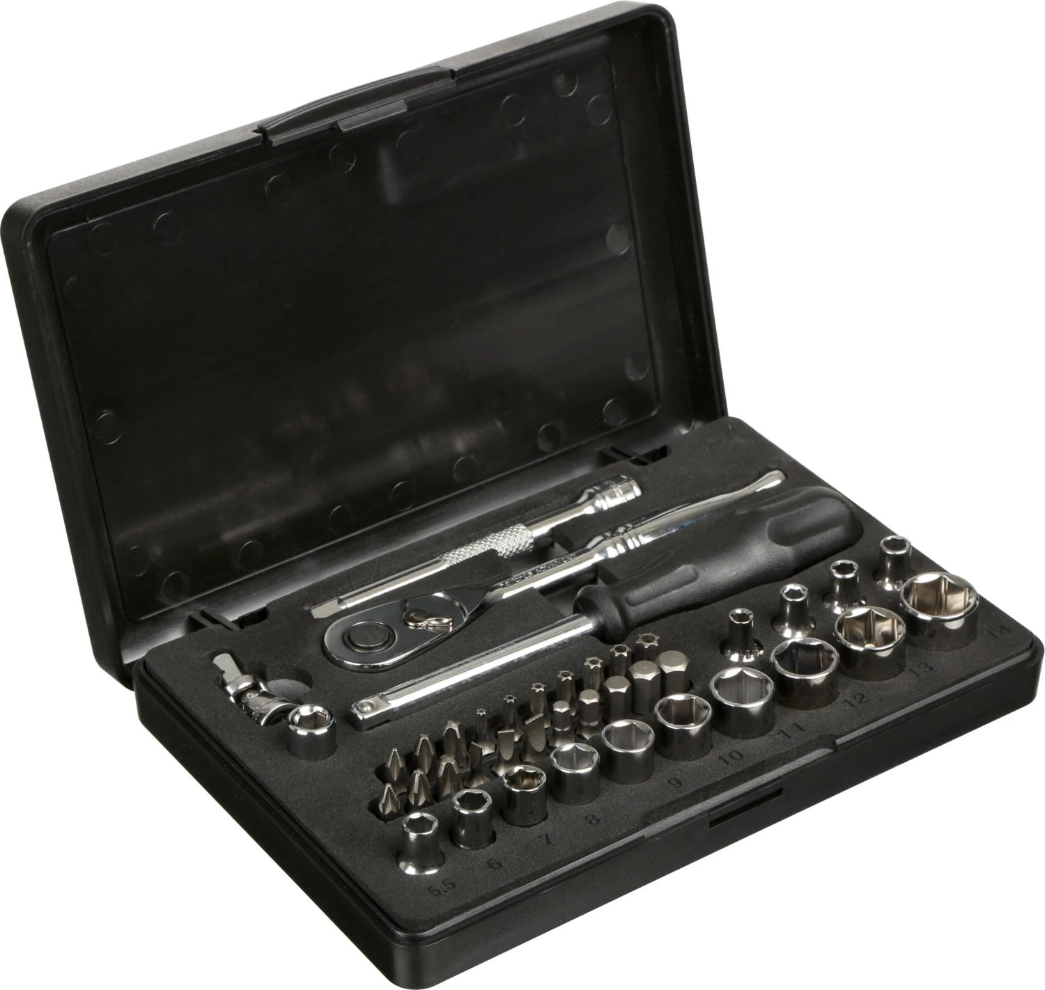 1 x 1/4″ drive 100 tooth ratchet handle, 14 x 1/4″ drive 6-point sockets: 3.5, 4, 4.5, 5, 5.5, 6, 7, 8, 9, 10, 11, 12, 13 and 14mm, 1 x 1/4″ drive spinner handle, 1 x 1/4″ drive extension bar: 100mm, 1 x 1/4″ drive universal joint, 1 x 1/4″ drive bit adaptor, 21 x 1/4″ shank bits: #1, #2 and #3 (Phillips); #1, #2 and #3 (Pozi); 3, 4 and 5.5mm (slotted); 4, 5, 6, 7 and 8mm (hex); T10, T15, T20, T25, T27, T30 and T40 (security torx)