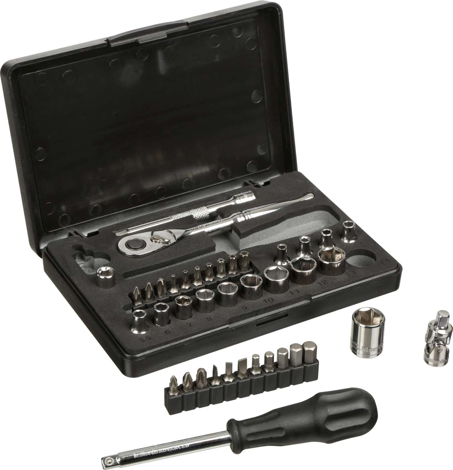 TheHalfords Advanced 40 Piece 1/4″ Socket Set provides a lower swing arc, which means you need just 3.6 degrees of movement before the next tooth is engaged. Combined with the low profile head design, this makes it the perfect choice for working in confined spaces. The longer handle gives you better access and increased leverage, and the quick release button allows sockets to be easily detached. Halfords Advanced ratchets and sockets are made from durable chrome alloy steel, and the 6-point 1/4” sockets grip the flat sides of the fastener rather than the corners to reduce the risk of rounding. A selection of hex, security torx, cross point, Pozidriv and plain slot bits are included for other styles of fixings. The ratchets and sockets are stored inside an injection moulded case with EVA foam to prevent them from rattling, and to keep the tools safe and secure.