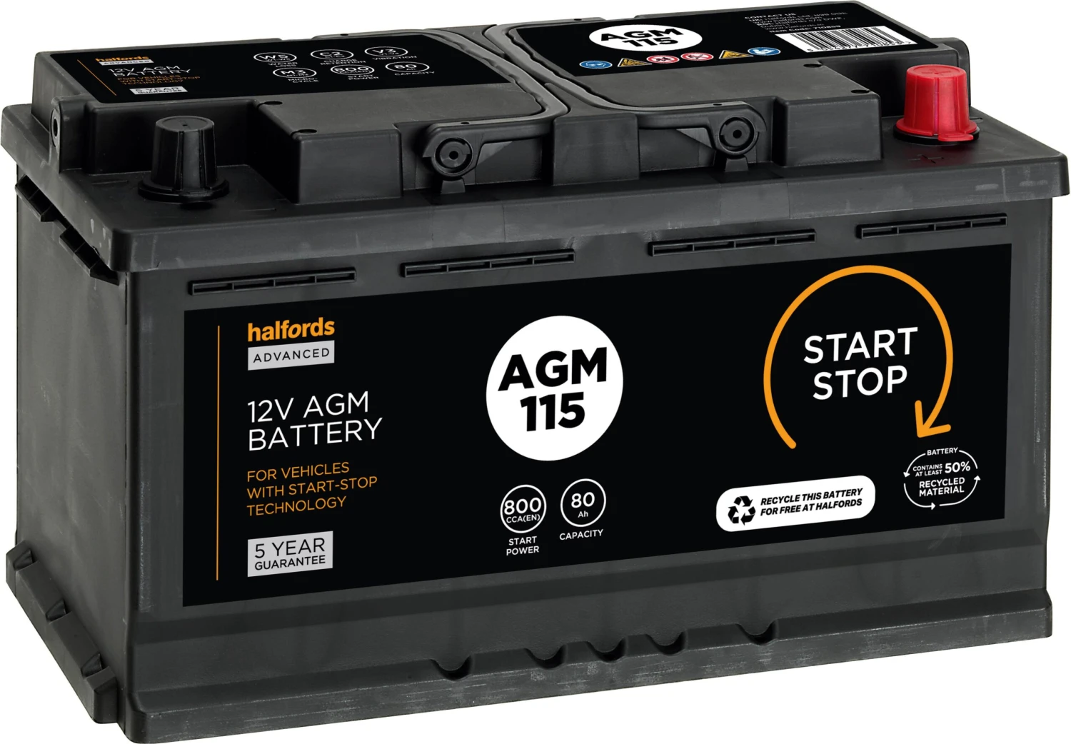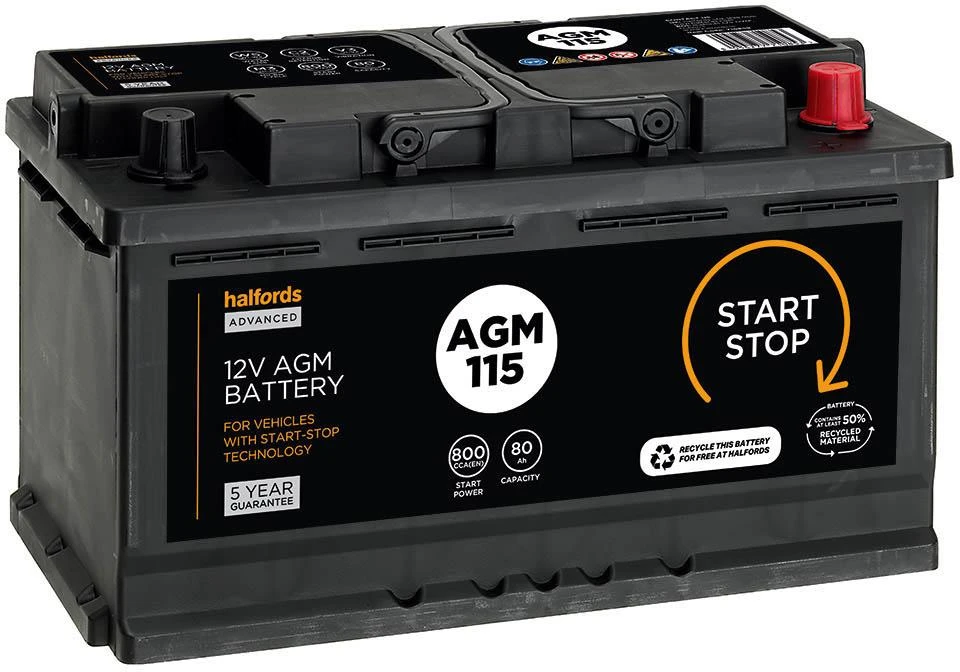 The Halfords AGM115 Start/Stop 12V Car Battery 5 Year Guarantee is required for vehicles with start/stop technology and/or regenerative braking. The AGM (absorbed glass mat) technology allows up to 360,000 engine starts with start/stop functions.