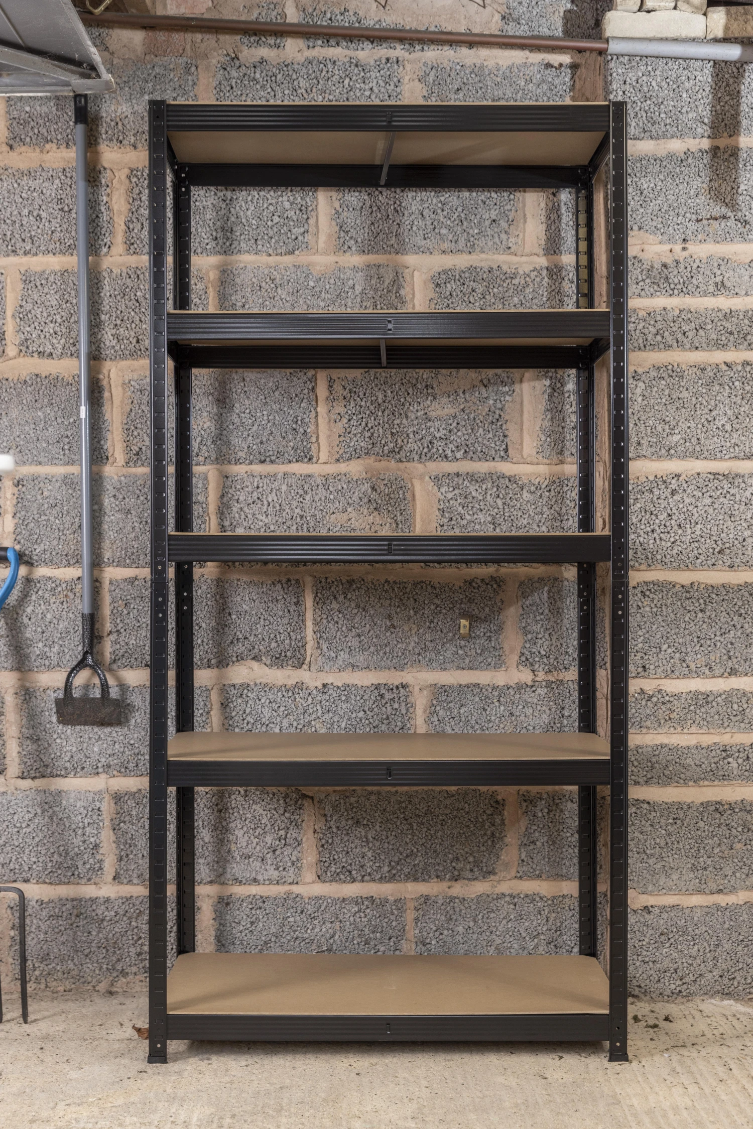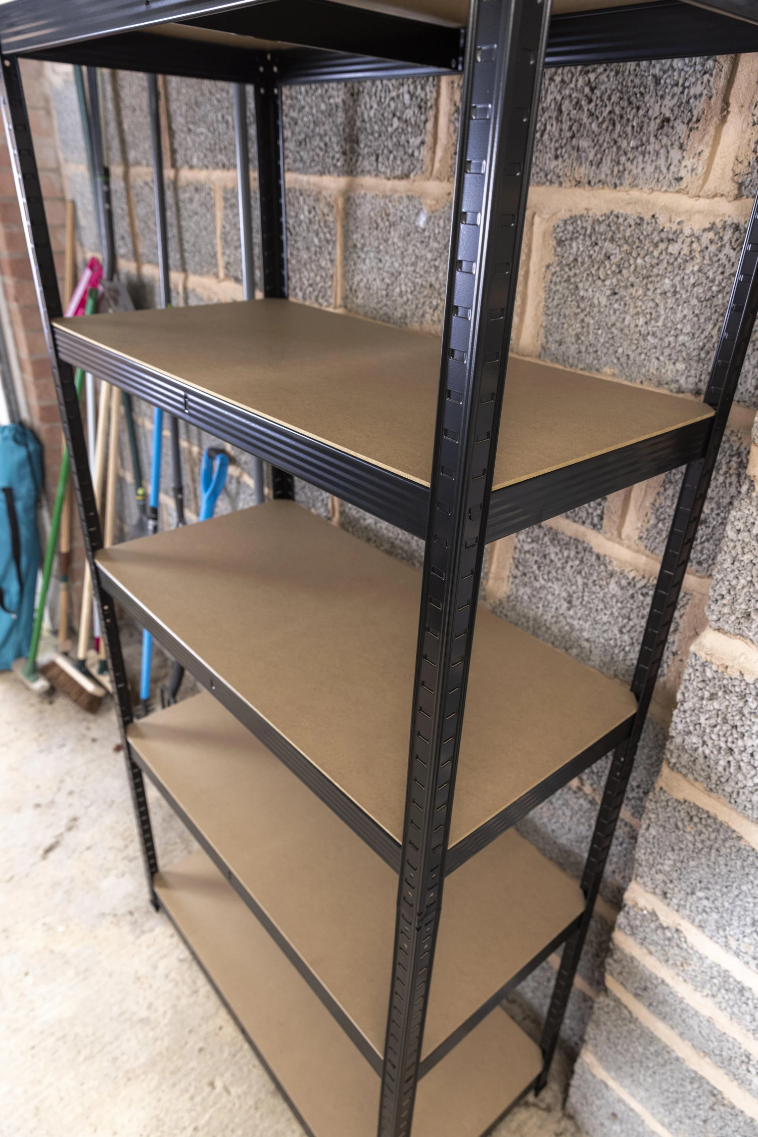 The boltless design means that the unit is simple to build and adaptable. It can be assembled as a full height freestanding unit with five shelves or as a half-height workbench with shelves underneath.