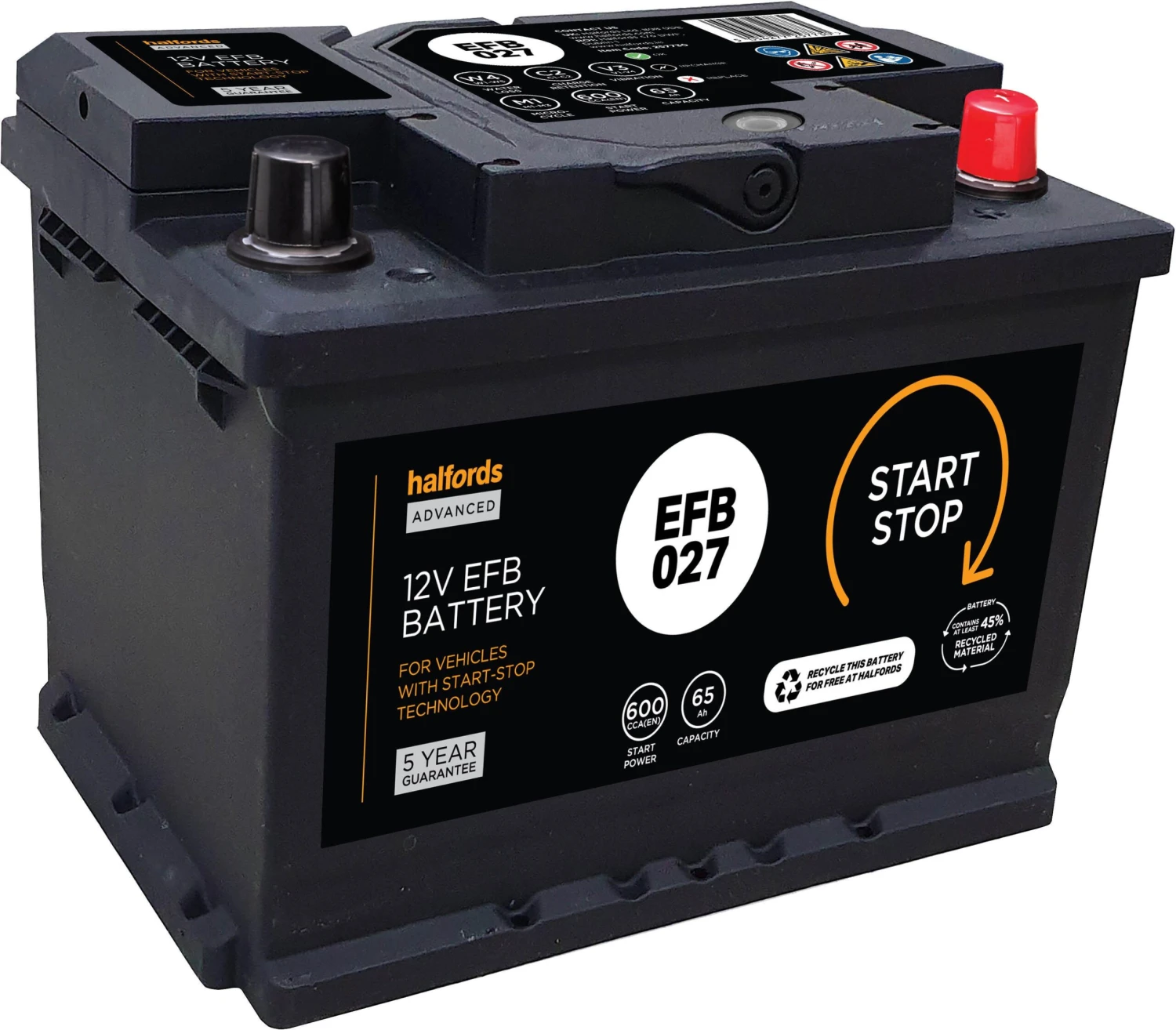 The Halfords EFB013/EFB027 Start/Stop EFB 12V Car Battery 5 Year Guarantee comes fully charged and ready to fit, and allows up to 270,000 engine starts for use with start/stop function.
