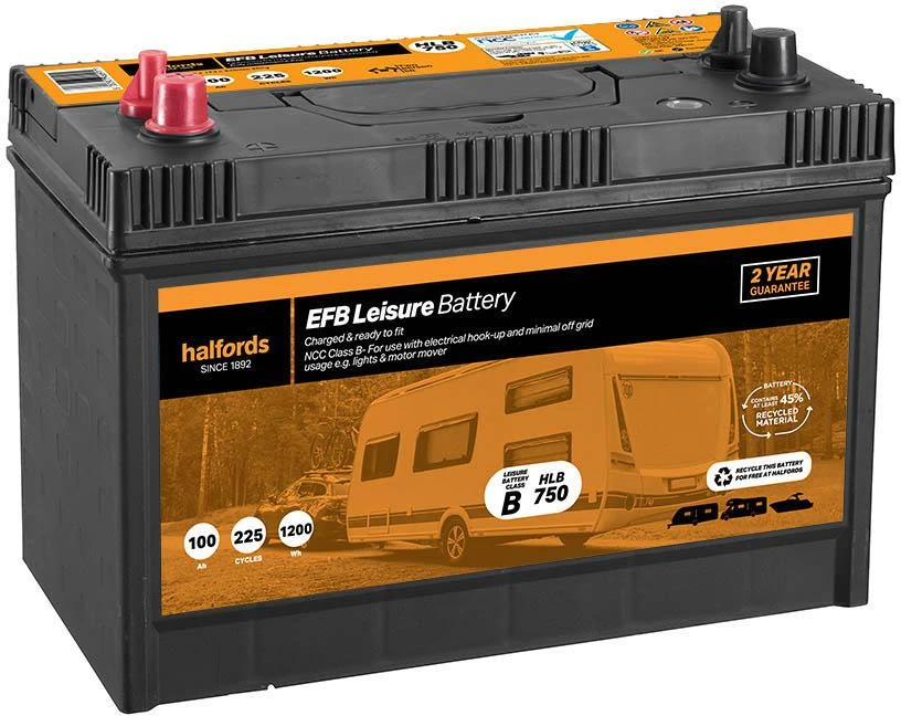 The Halfords Leisure Battery HLB750 is optimised for regular usage and provides up to 1200 watt hours. Benefitting from a dual terminal design, this 12V battery can power multiple devices at once and allows easy wiring for motor movers.