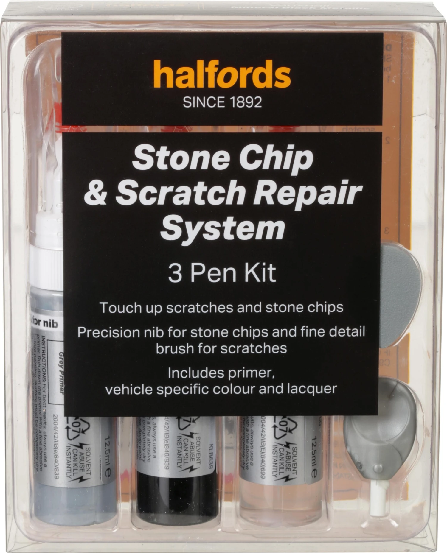 The touch up paint is the ideal way to repair small unsightly scratches and stone chips on your cars bodywork, blending them in with an exact colour match. Simply use the special glass fibre prep tool to remove any loose/flaking paint and all rust from the chip or scratch. Then apply the high build primer filler using the precision nib applicator or brush into the prepared rust free chips and scratches, building up the thickness in stages (leaving 10-20 minutes between coats) leaving 24 hours to harden.
