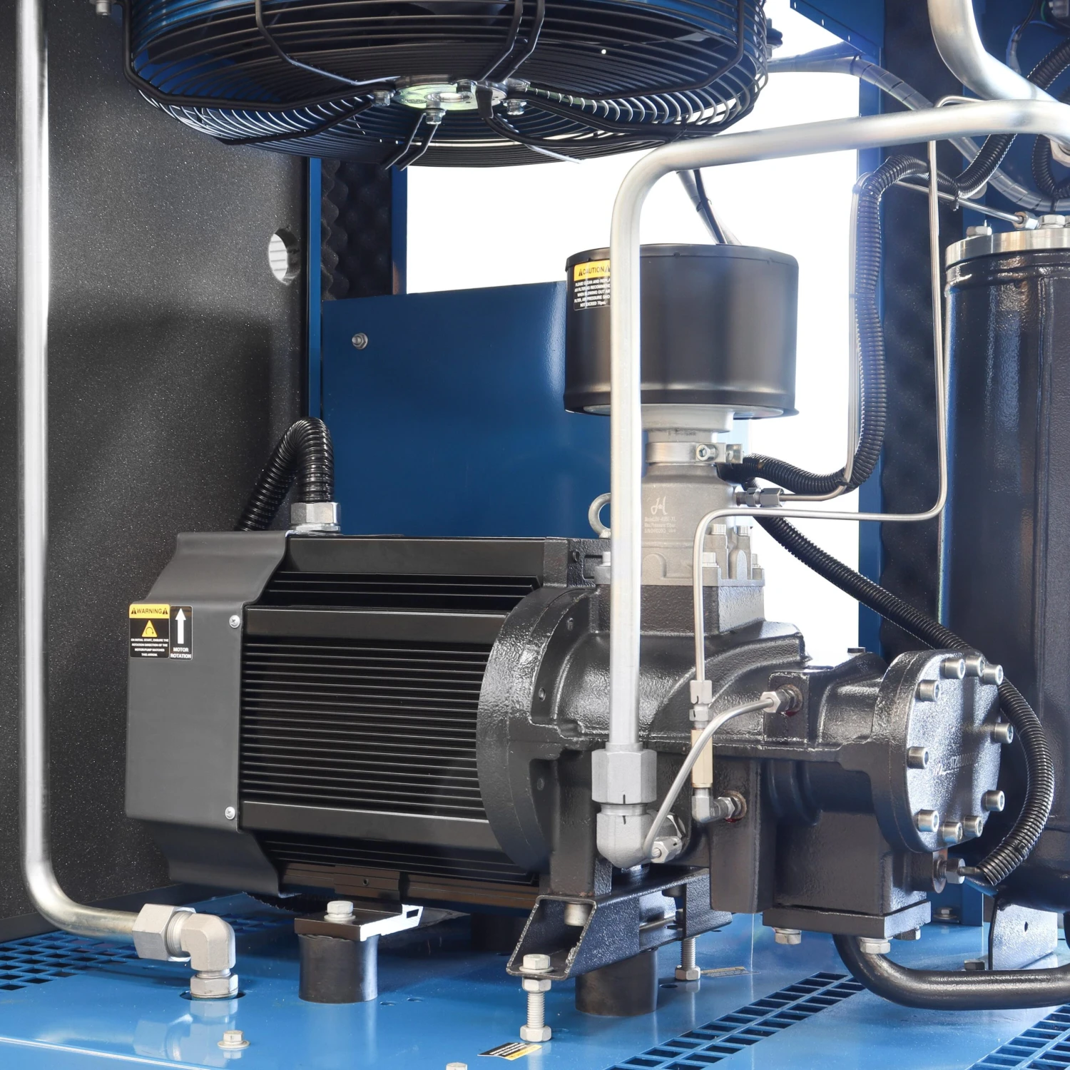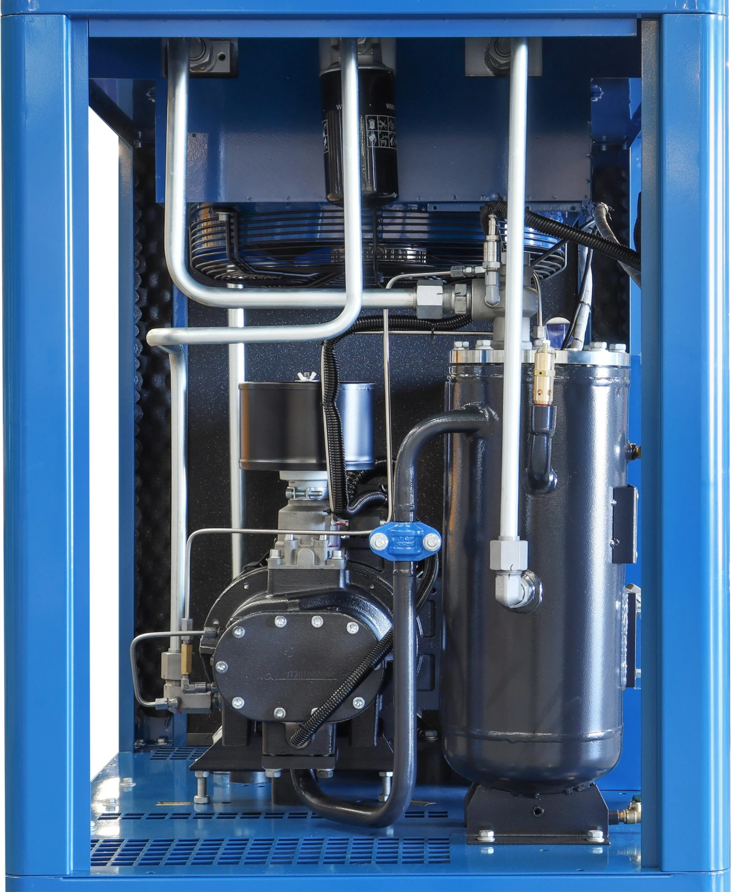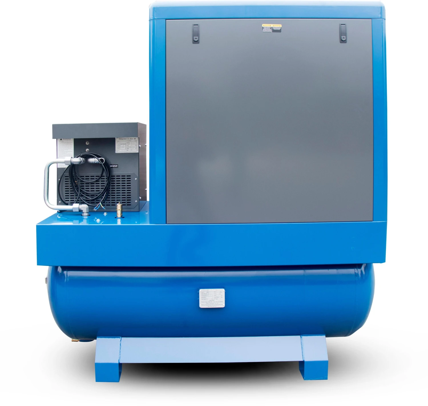 The high-efficiency motor and screw compressor unit is designed for continuous operation, with long service intervals and low maintenance and features an integral air dryer to remove moisture entering the tank.