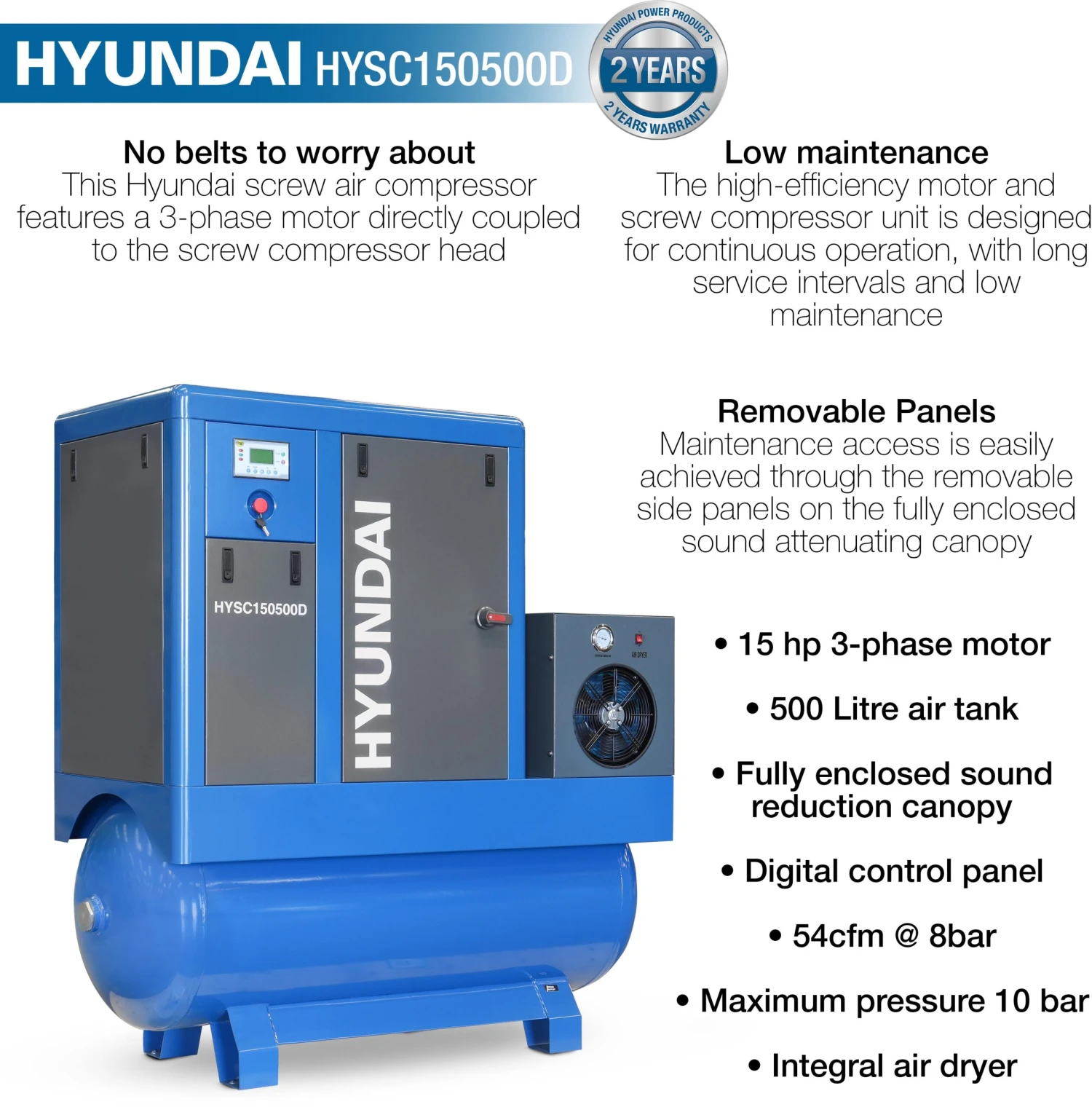Hyundai 15hp 500L Screw Compressor with Dryer