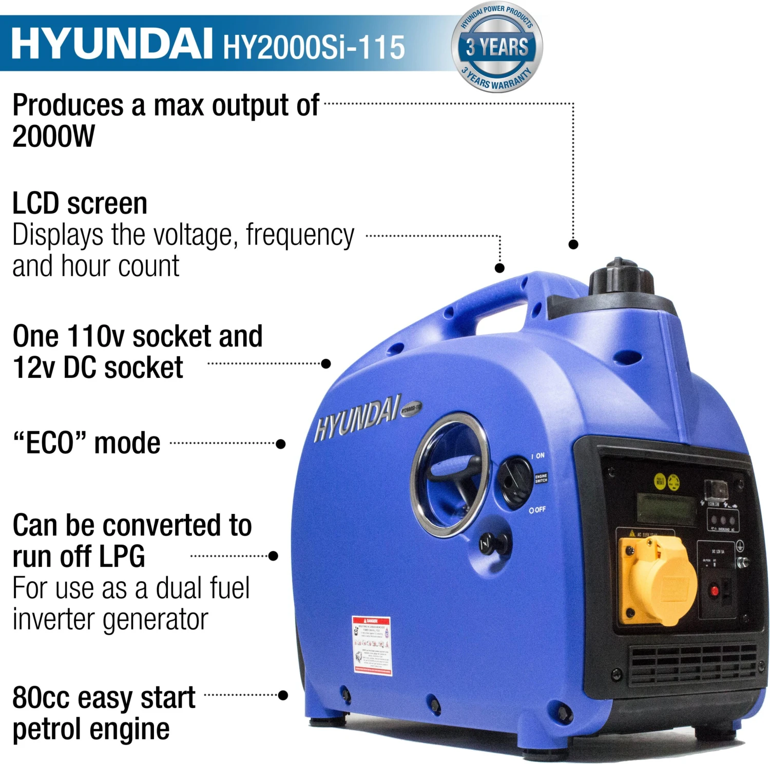 The HY2000Si-115 is a compact, lightweight and portable 110v inverter generator from Hyundai providing a convenient and cost-effective power source, producing 1600w / 1.6kW.