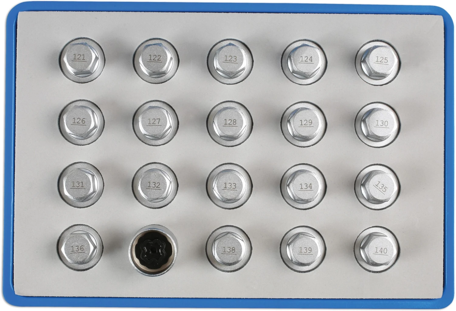 A 20 piece wheel nut set for Vauxhall/Opel wheel nuts, for use where the original key is missing or lost. The OEM key numbers listed are equivalent to the key numbers shown in the original manufacturers vehicle service details and on the original wheel locking key. Covers a wide range of Vauxhall/Opel models; suitable for tyre fitting bays and garages.