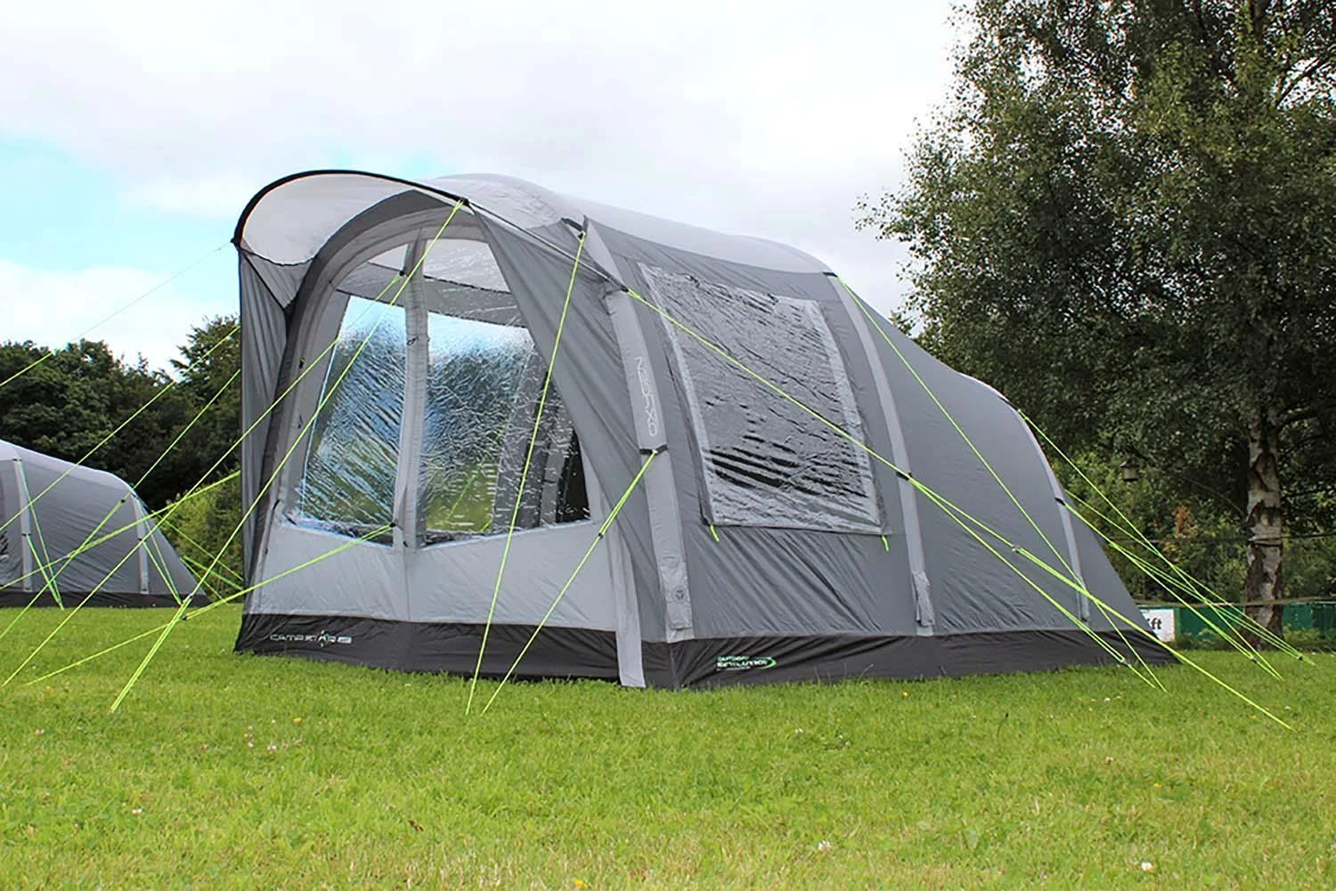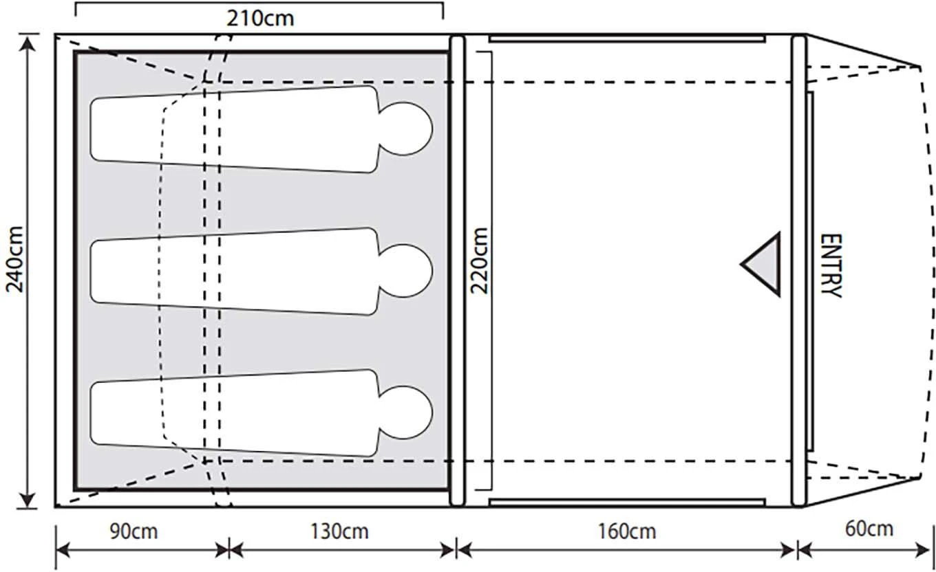 - The breathable three berth inner tent included can be clipped in to provide a luxurious sleeping area, designed to accommodate up to three average size adults. This is created using our darkened grey ‘twilight’ fabric, in order to cut down on exterior light and help you attain a deep, cosy and uninterrupted night’s sleep. This model utilises our bedroom ventilation system to maintain a comfortable sleeping environment by optimising air flow, whilst helping combat condensation and internal humidity.