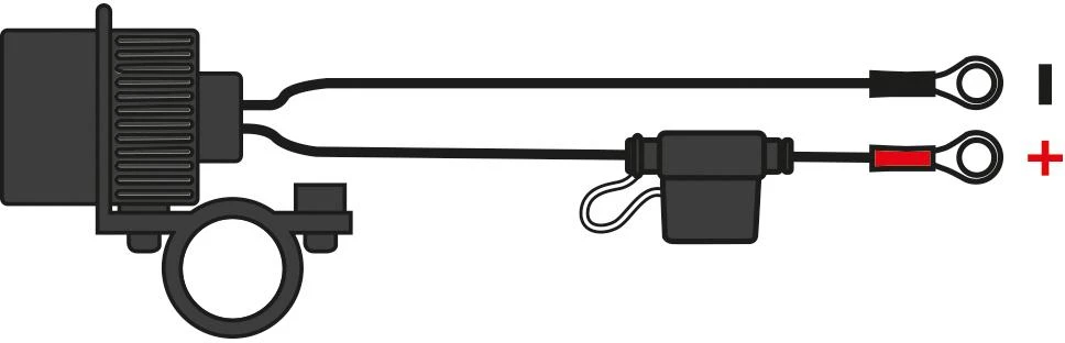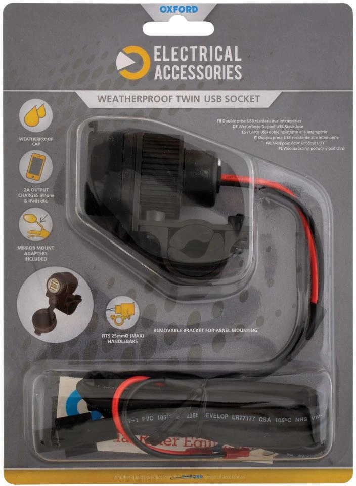The Oxford Weatherproof Dual Port USB Charger has a heavy duty weatherproof cap that keeps the insides dry whilst raining. Designed for upto 25mm handlebar mounting but can also be mounted on the mirror stem using the unique adapters provided it can be panel mounted if required by removing the outer bracket. We recommend connecting to an ignition switched live feed to prevent battery drain over time. It comes with a 1.2mtr long wiring loom which is fitted with a 10amp standard blade fuse