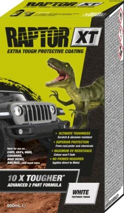 An extra tough textured coating that gives maximum protection to vehicles and other surfaces. Its advanced 2 part formula is up to 10 times tougher than other 1 part coatings*. It forms a highly durable, UV and water resistant barrier that protects surfaces from impact, scratches, corrosion, chemical spillages, fuels, fresh and salt water and much more. RAPTOR XT has superior adhesion and can be spray or roller applied directly to metal, without the need for a primer. It gives an attractive semi-gloss, textured finish that will stay looking great for years. Ideal for use on truck beds, underbodies, van interiors and floors, trailers, caravans, boat decks, railings and more. Click Here for details on how to use our Raptor XT products