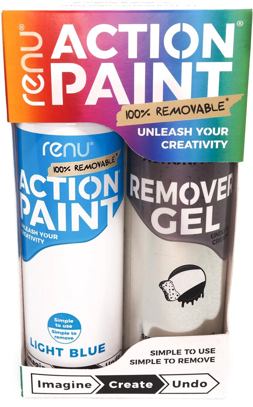 - To remove the paint always use Renu Remover Gel as it has been specifically designed to remove Action Paint gently and not damage other surfaces. Put the gel on the paint, leave for 2 – 5 minutes and wash it off. You can use a soft brush or cloth to wipe it off and can reapply if needed.