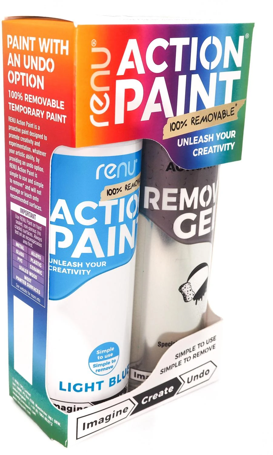 Paint with an UNDO option. Simple to use and simple to remove. Unleash your creativity with the Action Paint Pro Pack (containing 1x 300ml Action Paint and 1x 300ml Remover Gel). Action Paint is “Paint with an Undo option” – the 100% removable paint system that is simple to use and simple to undo!