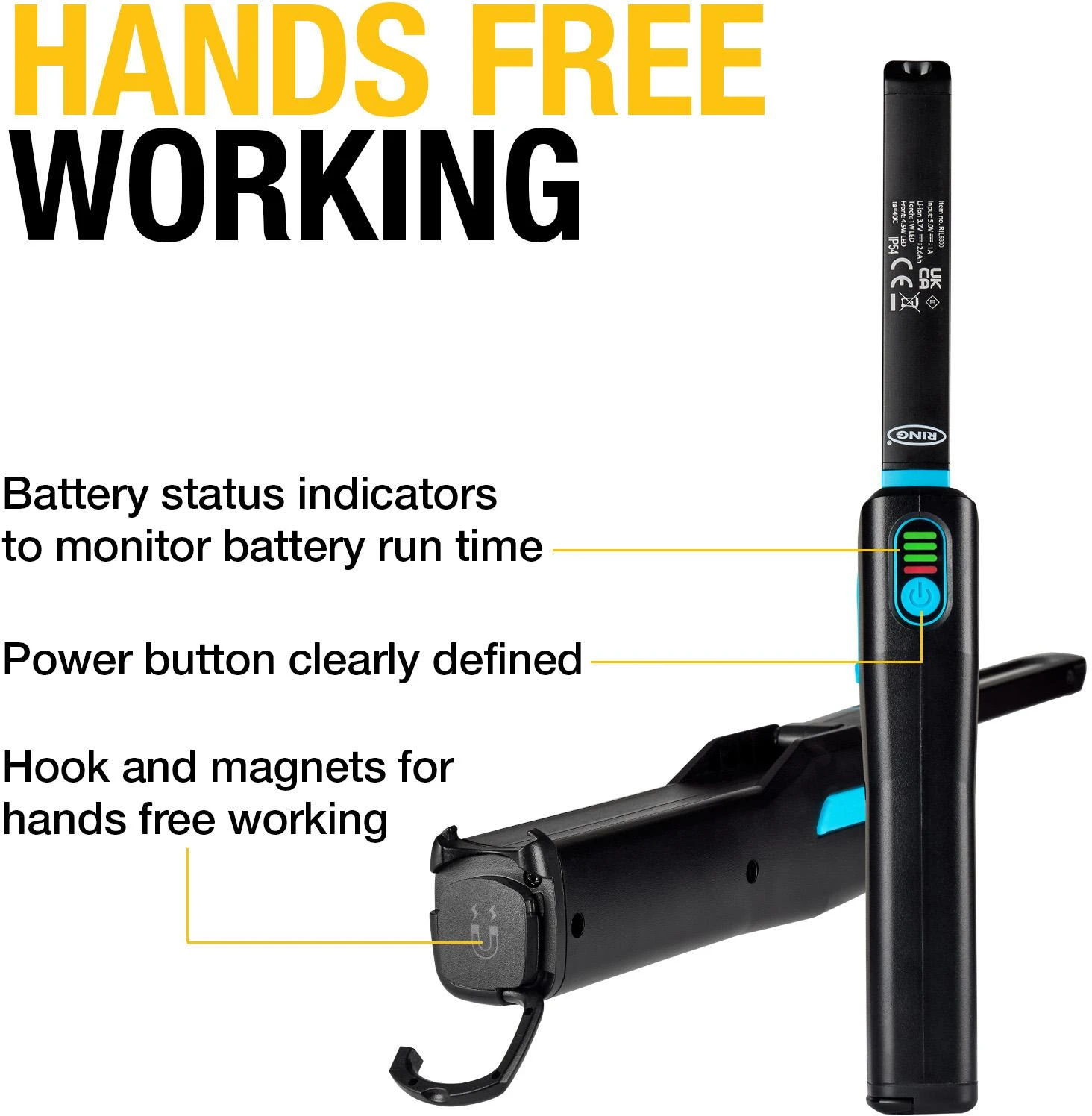- Also includes integrated magnets on the back and base of the lamp as well as a rotating hook for hands free working