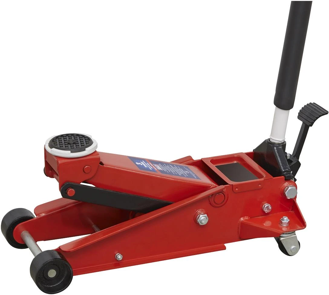 The Sealey 3T Trolley Jack is a single-piece hydraulic unit with a heavy base design. It features a universal joint release mechanism, long 2-piece handle and foot pedal which is a fast lifting alternative method of raising the saddle, particularly useful in restricted spaces. The protective jack handle sleeve helps prevent accidental damage to car bodywork, and the extra-large saddle design helps ease of positioning under the vehicle. It is fitted with a safety overload valve and pump-through valve to prevent handle locking at maximum ram extension.