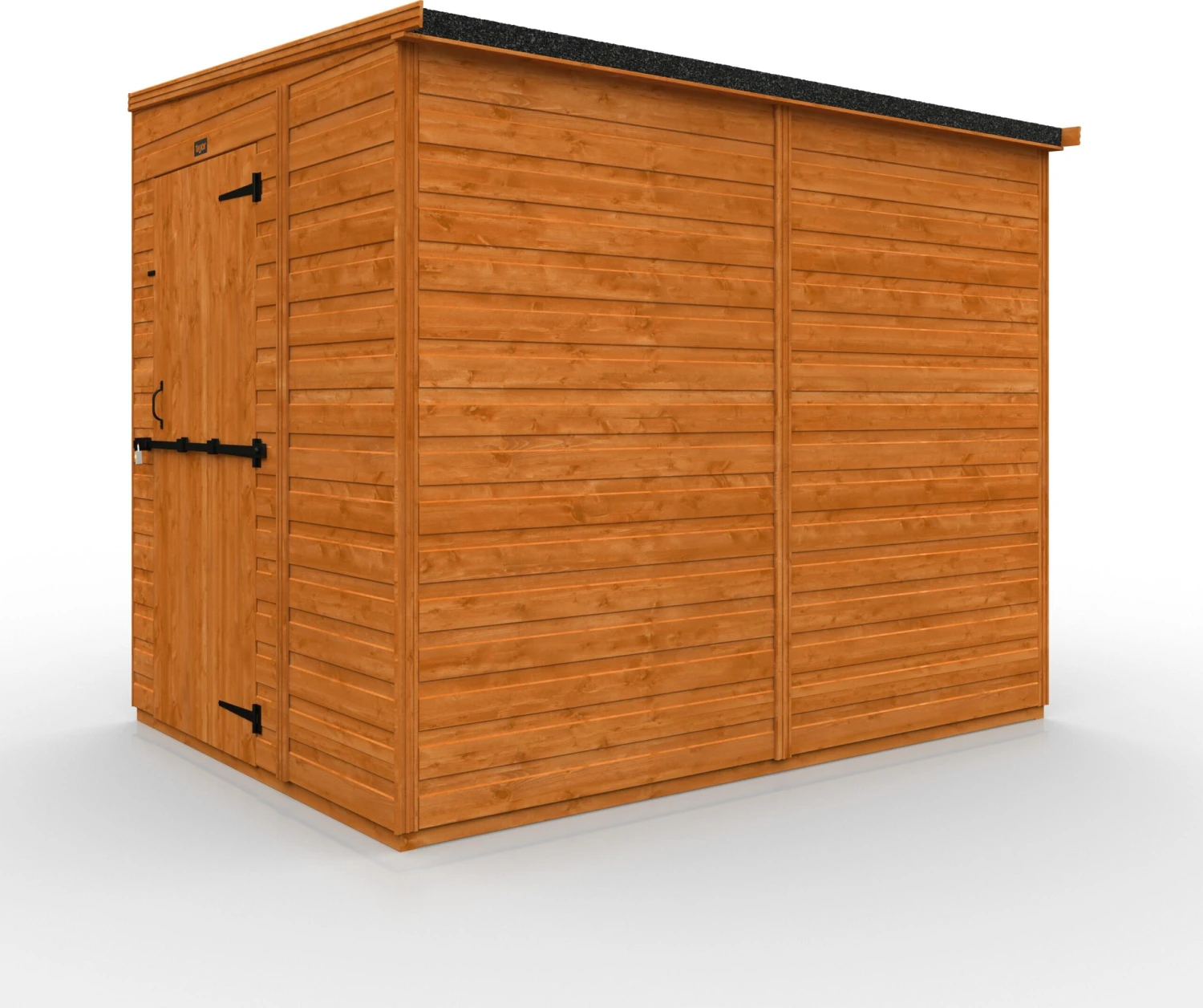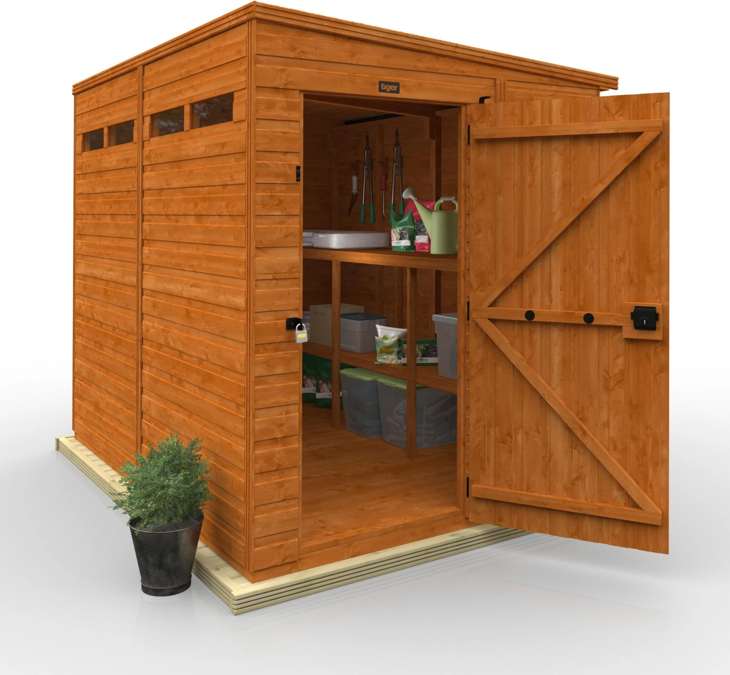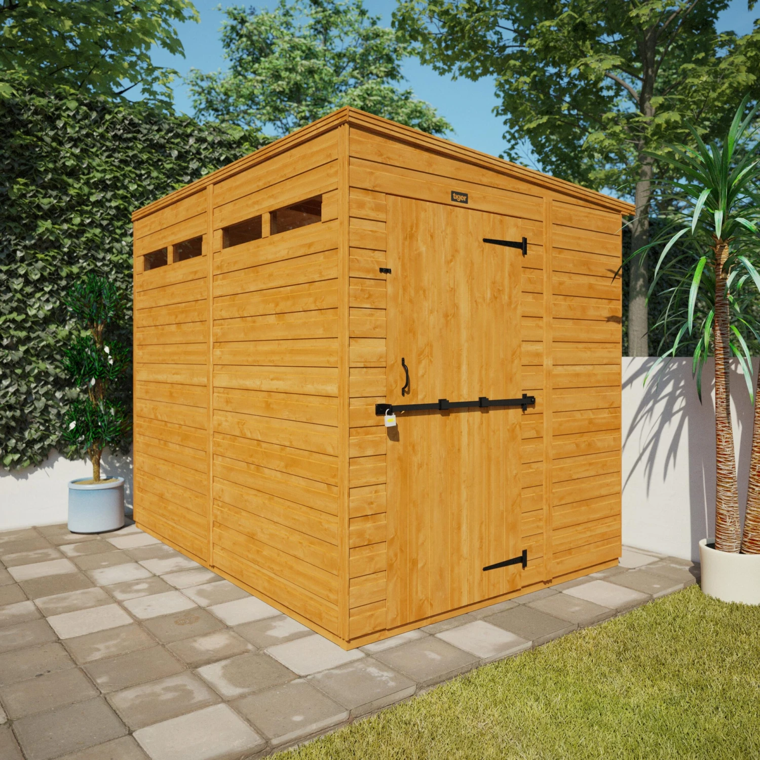 With security windows and a FREE security protection bar, this is a more secure garden shed.. The only thing likely to get through the toughened glass security windows is sunlight, while the solid metal protection bar adds a strong barrier for the door. The 44x28mm thick framing provides an additional sense of strength and sturdiness, and the 12mm thick shiplap cladding provides a solid wooden wall. You can also place the slit windows and door to the most secure configuration to suit your shed's location. The door can be hung either right or left hinged as appropriate, and you can then fit the bar to match it. The Pent Security Shed comes with extra high eaves ensuring there is ample height within so most people can stand upright easliy when inside. The shed sits on floor joists to lift the building off the ground. Durable black mineral roofing felt is supplied as standard to protect it from the elements and unwanted water ingress.