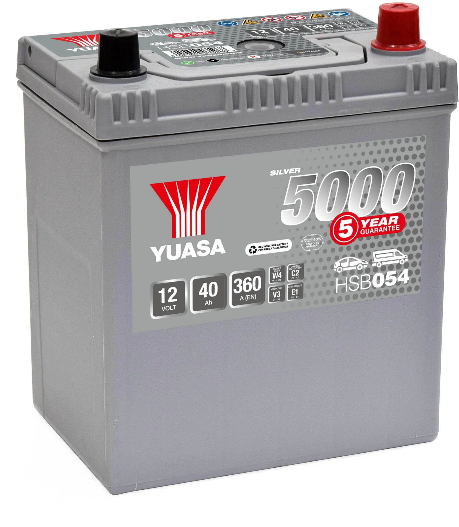 The Halfords HSB054 Lead Acid 12V Car Battery 5 year Guarantee allows around 50,000 engine starts as compared to around 20,000 on a normal battery. The Silver car batteries come fully charged, ready to fit, and are completely maintenance-free.