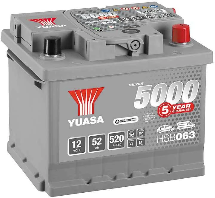 The Yuasa HSB063 Silver 12V Car Battery 5 Year Guarantee allows around 50,000 engine starts as compared to around 20,000 on a normal battery. The Silver car batteries come fully charged, ready to fit, and are completely maintenance-free.