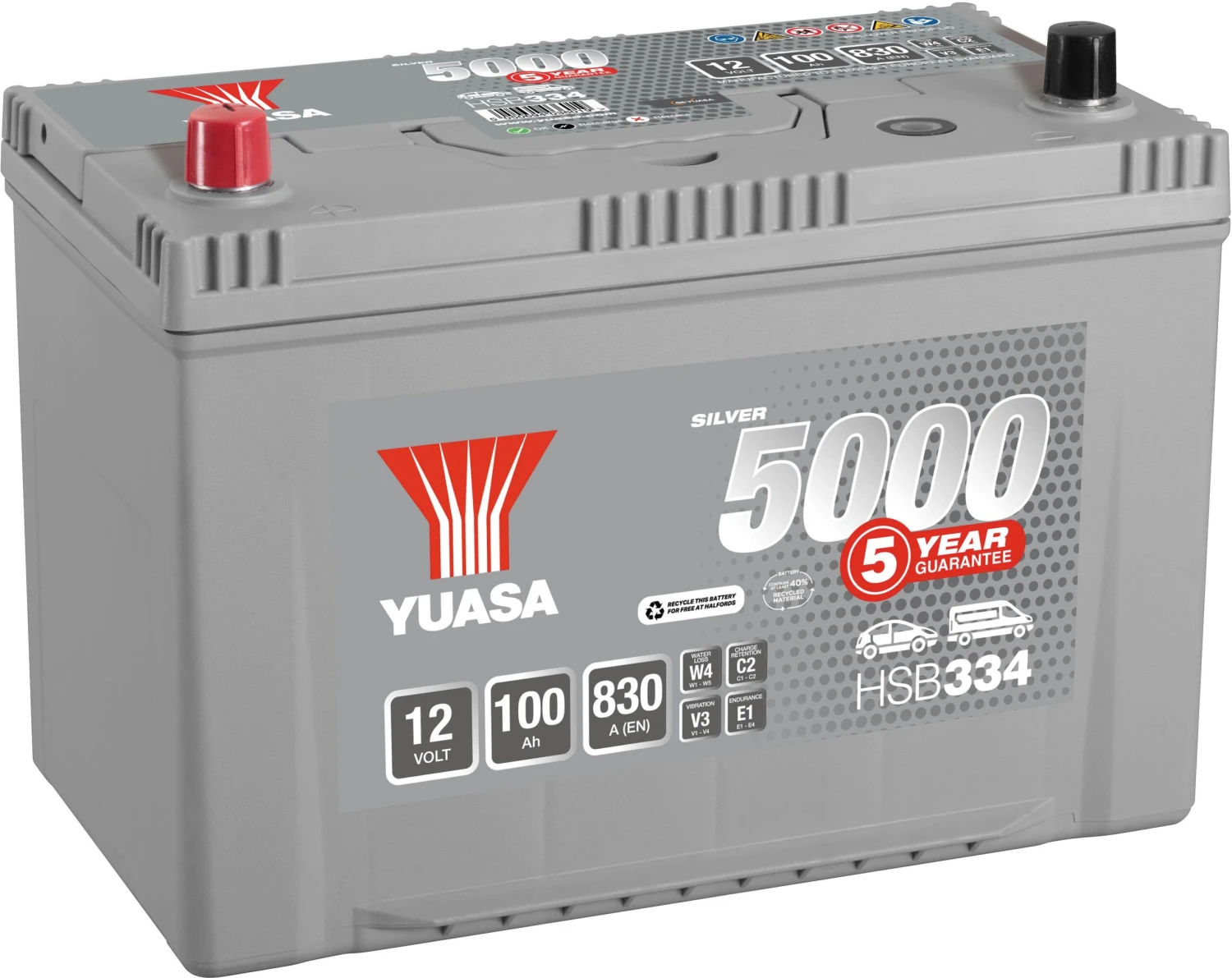 The Yuasa HSB334 Silver 12V Car Battery 5 Year Guarantee allows around 50,000 engine starts as compared to around 20,000 on a normal battery. The Silver car batteries come fully charged, ready to fit, and are completely maintenance-free.